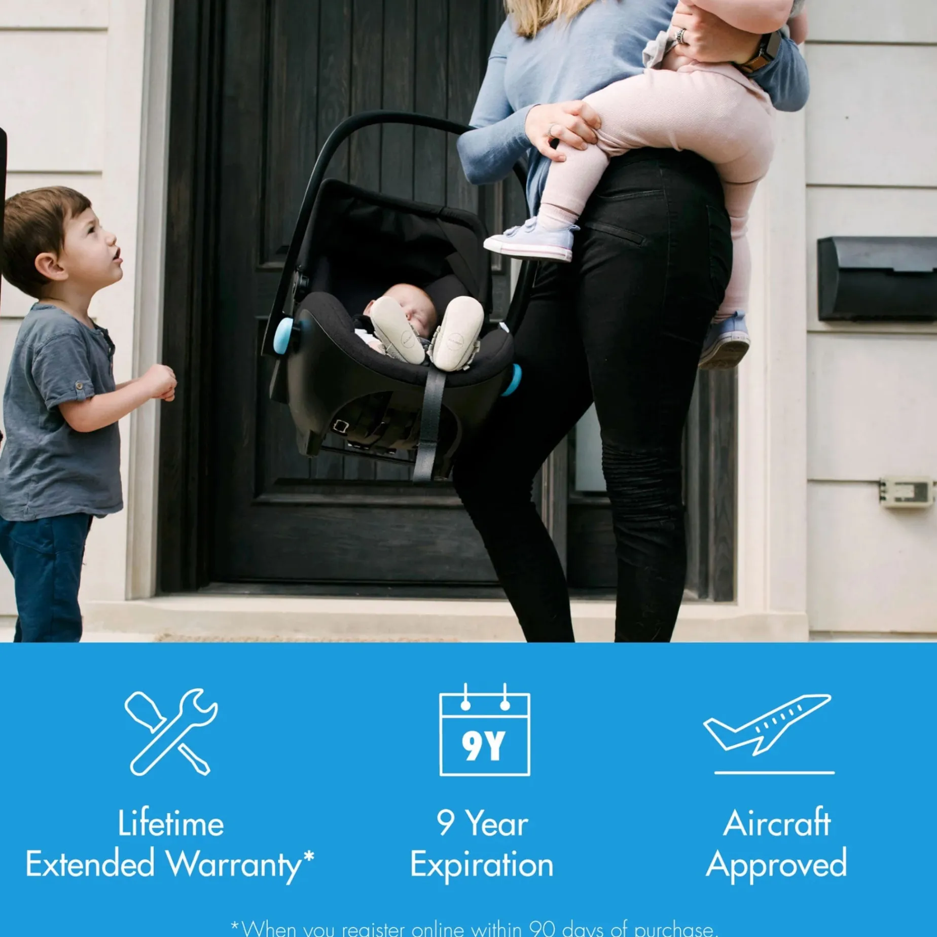 Liingo weighs 9 lbs**, is compatible with the stroller brands you love and has a convenient one-handed quick release that makes it easy to remove from the stroller. Its newborn body support system ensures your little one is kept safely positioned, while the UPF 50+ adjustable canopy, complete with a mesh peekaboo window, provides sun protection, enhanced airflow, and visibility inside.