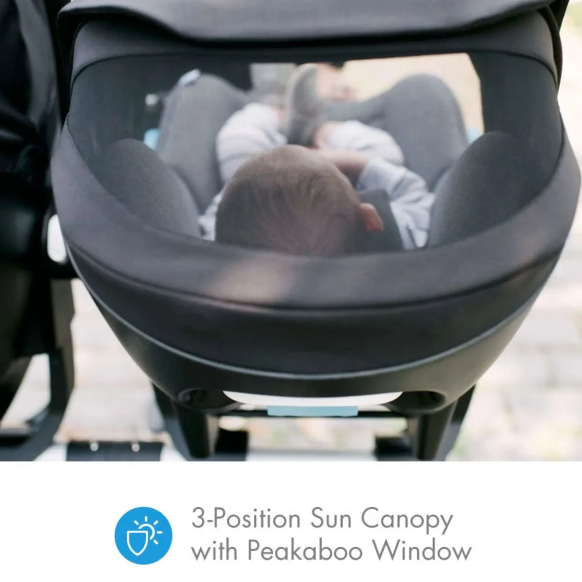 -3-position, UPF 50+ adjustable sun canopy provides almost full coverage from the sun, with a mesh peekaboo window for airflow and visibility into the car seat.