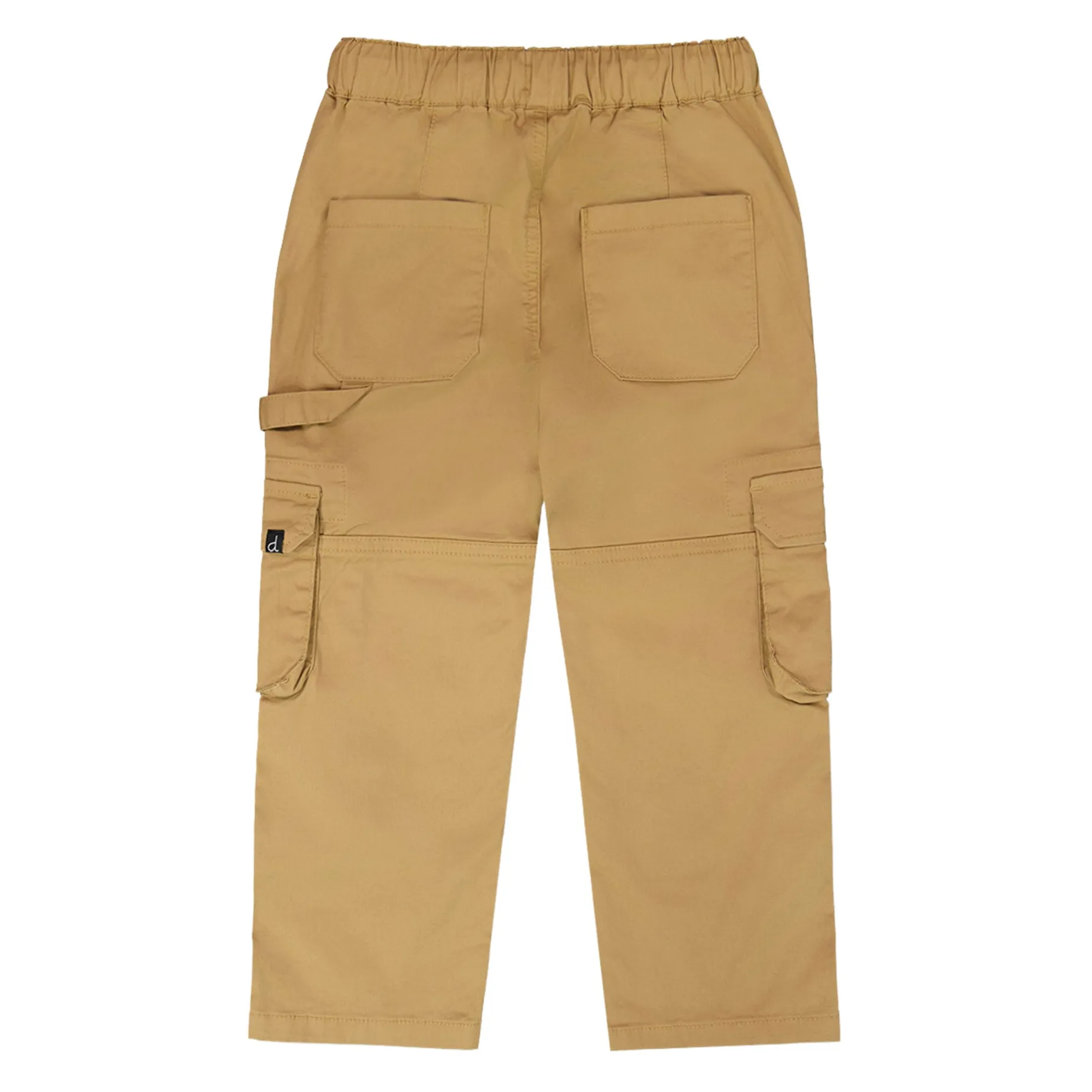 The stretch twill carpenter pants in beige are built for little explorers who love to move. Made from soft stretch twill, these bottoms feature deep slant pockets, functional side cargo pockets with flaps, and a comfortable elastic waistband with drawstring. Designed with reinforced seams at the knee and a straight relaxed leg, these practical pants keeps boys and baby boys ready for every outdoor mission.