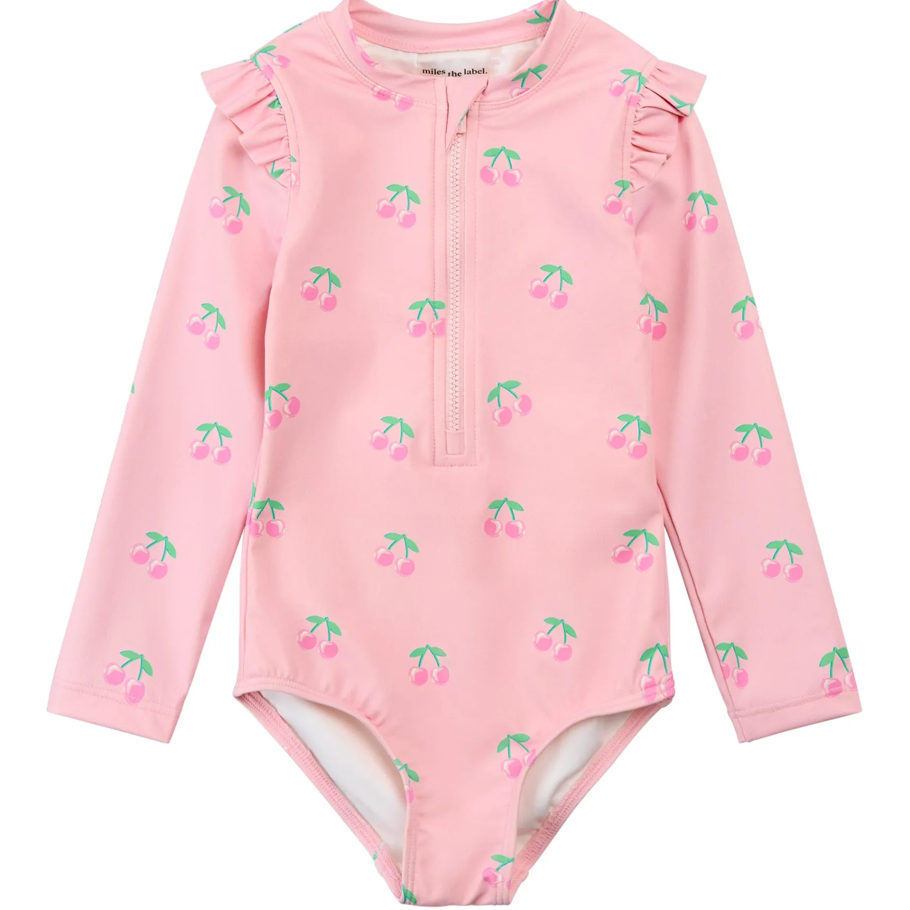 Sweet and summery, this pretty-in-pink rash guard suit features an all-over cherry print and a flutter trim along each shoulder. The half-zip front makes getting ready before and after a splash quick and easy, while the quick-drying fabric with UPF 50+ keeps her comfortable and safe during water or sand play.Â