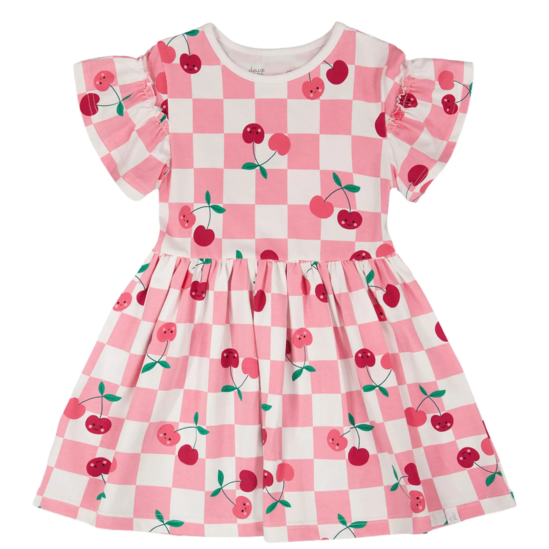 The organic cotton jersey dress in pink with printed cherries is made for sunny days and carefree play. This short-sleeve dress charms with flutter sleeves, a round neckline, and an allover checker and cherry print that feels both fresh and fun. Crafted in soft organic cotton jersey with a hint of stretch, it’s perfect for comfort with a playful twist from our “Cherry On The Check” collection.