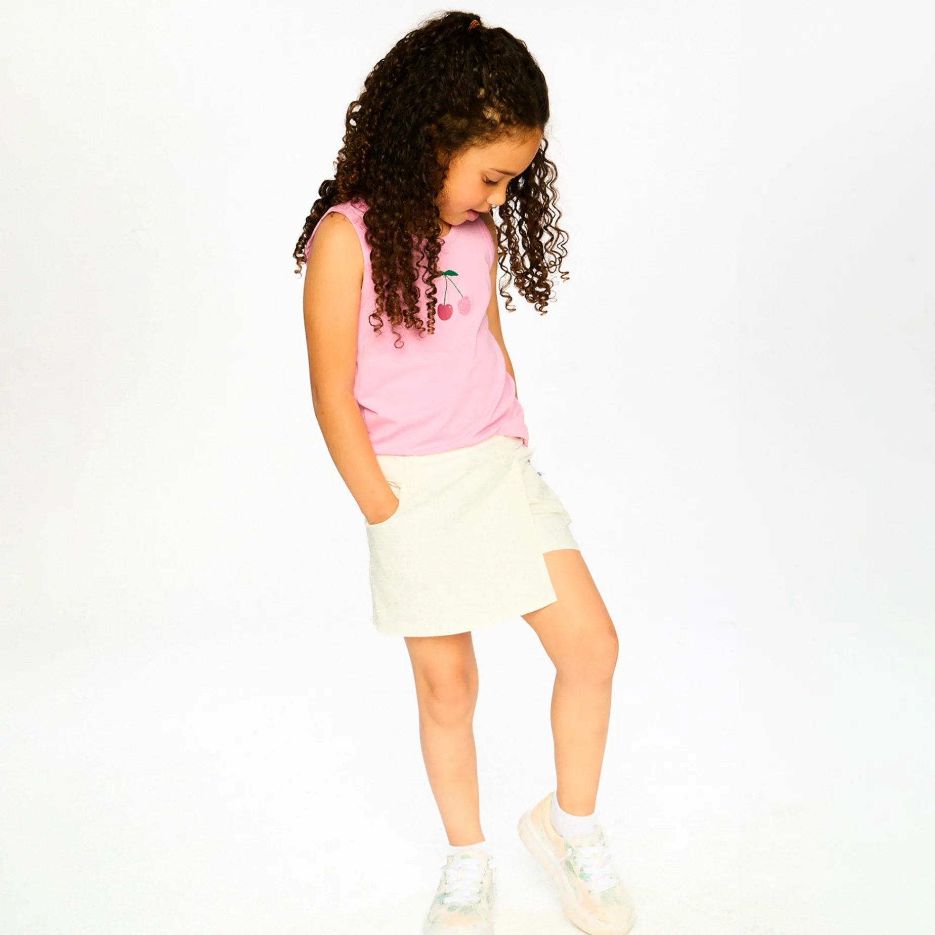 This organic cotton jersey tank top in pink is a sweet essential for sunny days. The sleeveless tee with a round neckline is finished with a printed cherry at the front for a playful accent. Made in organic cotton jersey with added stretch, it is soft, breathable, and comfortable for everyday wear.