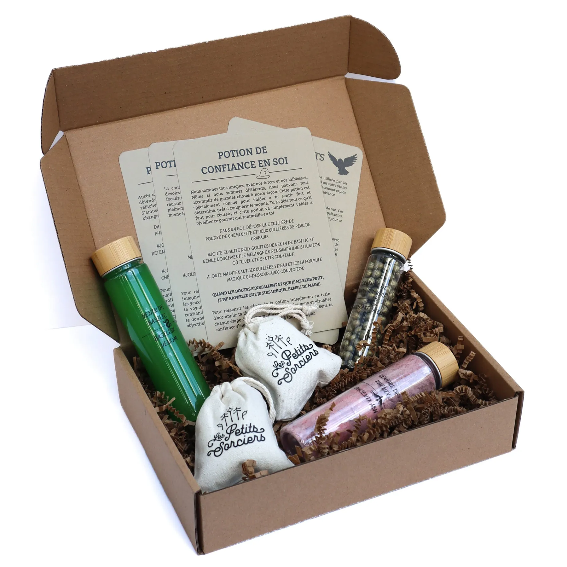 Discover the magical world of potions with this starter kit for wizard school. Inside this box, you’ll find everything needed to concoct three different potions — Self-Confidence, Relaxation, Concentration. Detailed instructions will guide your child to start the school year, or another activity, with confidence, relax after a long day of study, and enhance concentration for homework. Activate the power of bubbles and enjoy a magical experience with our playful potions kit