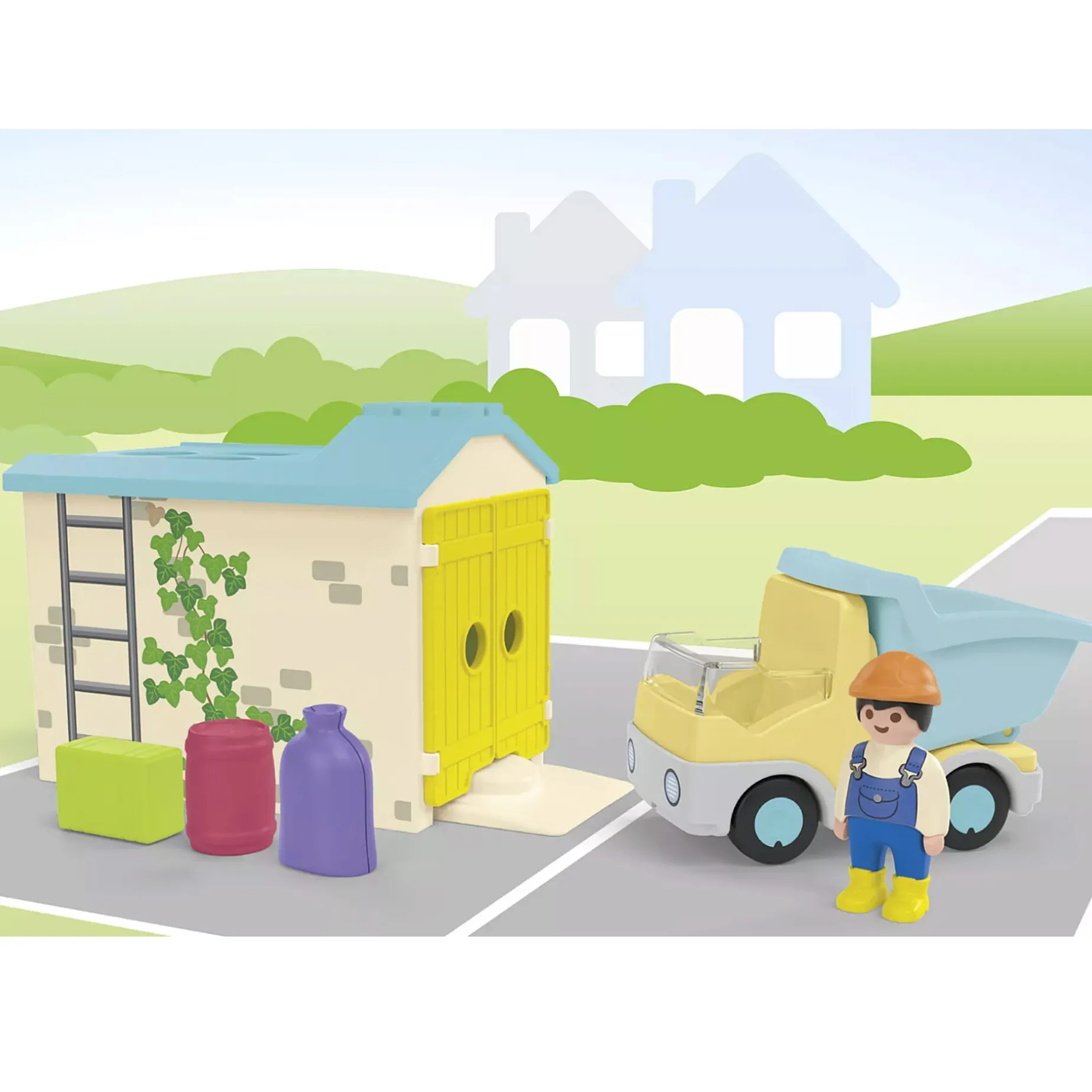 Give your little one a variety of experiences with this versatile toy! The construction worker takes his seat in the driver’s cab. When your child backs the truck into the garage, the bag, crate, and barrel find their place in the dump bed through the correct cutout. Which item will fall into the dump bed first?