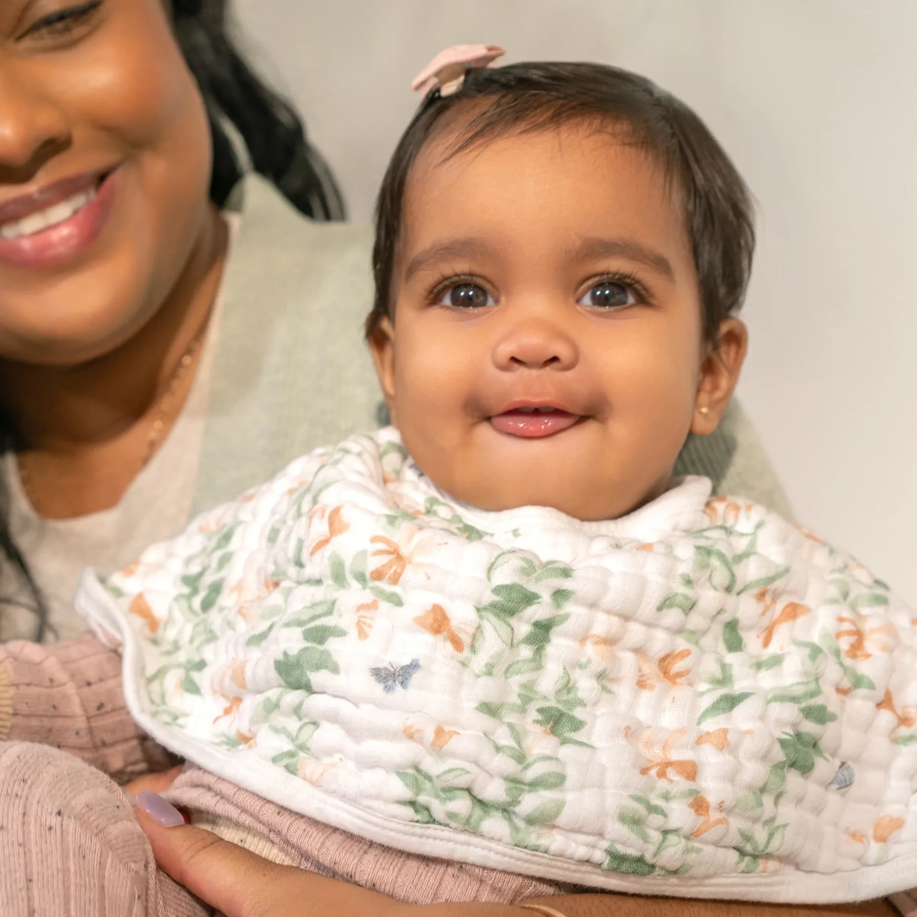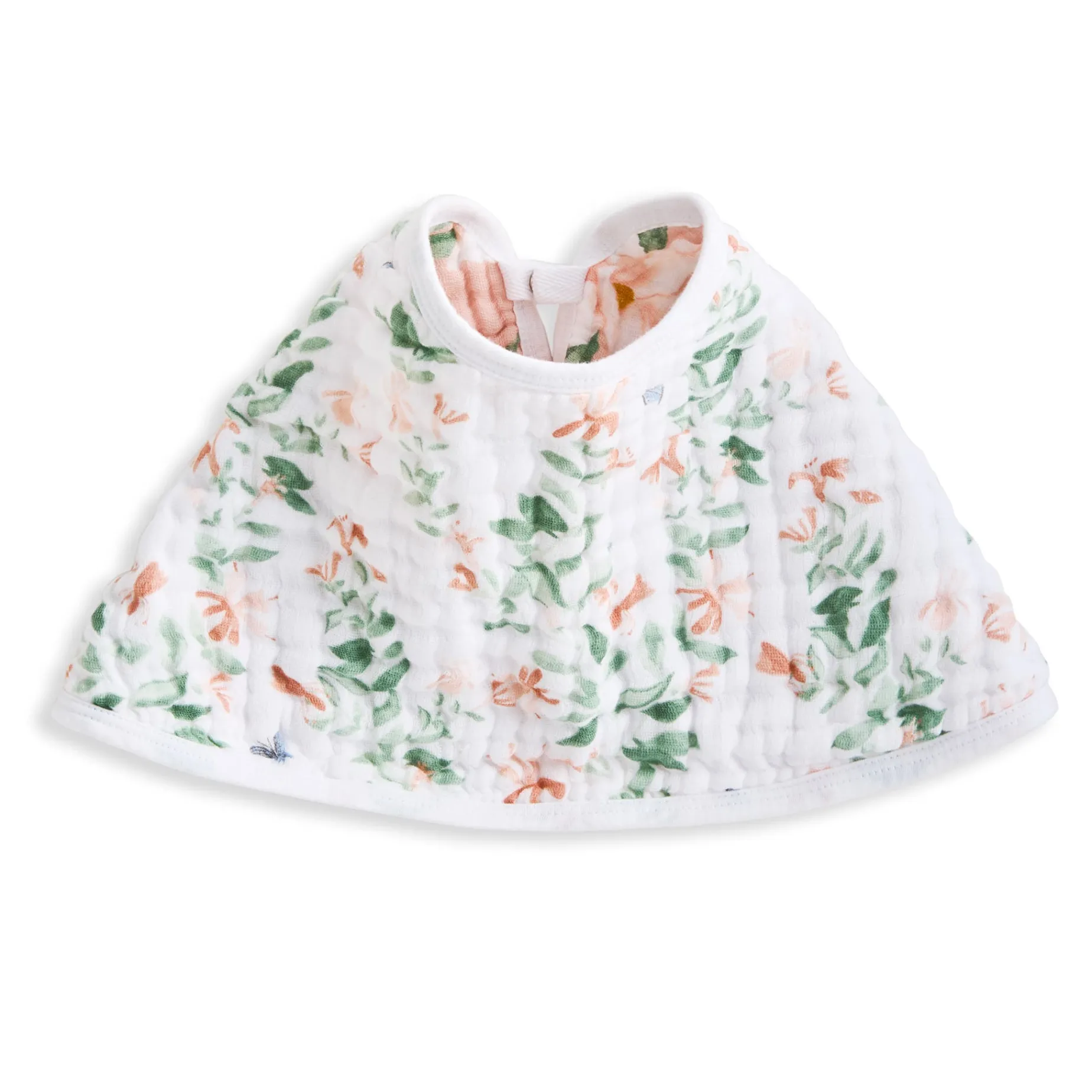 Aden by Aden & Anais patented burpy bib is designed to double as a bib and burp cloth. Drape it over baby’s shoulders and snap it at the back for a full-coverage bib or place it over your shoulder for a no-slip burp cloth.