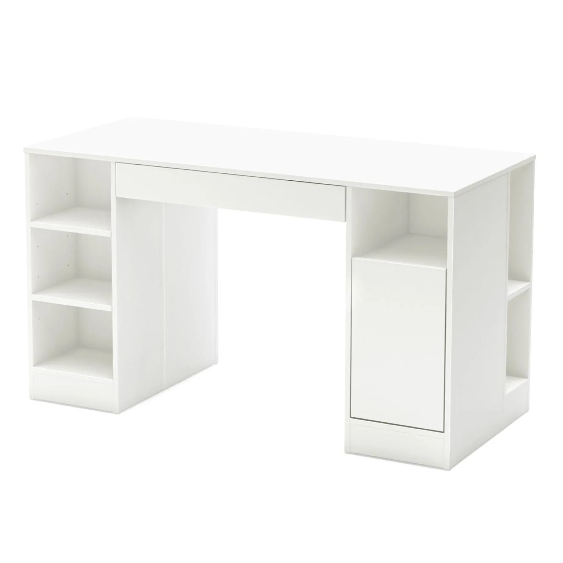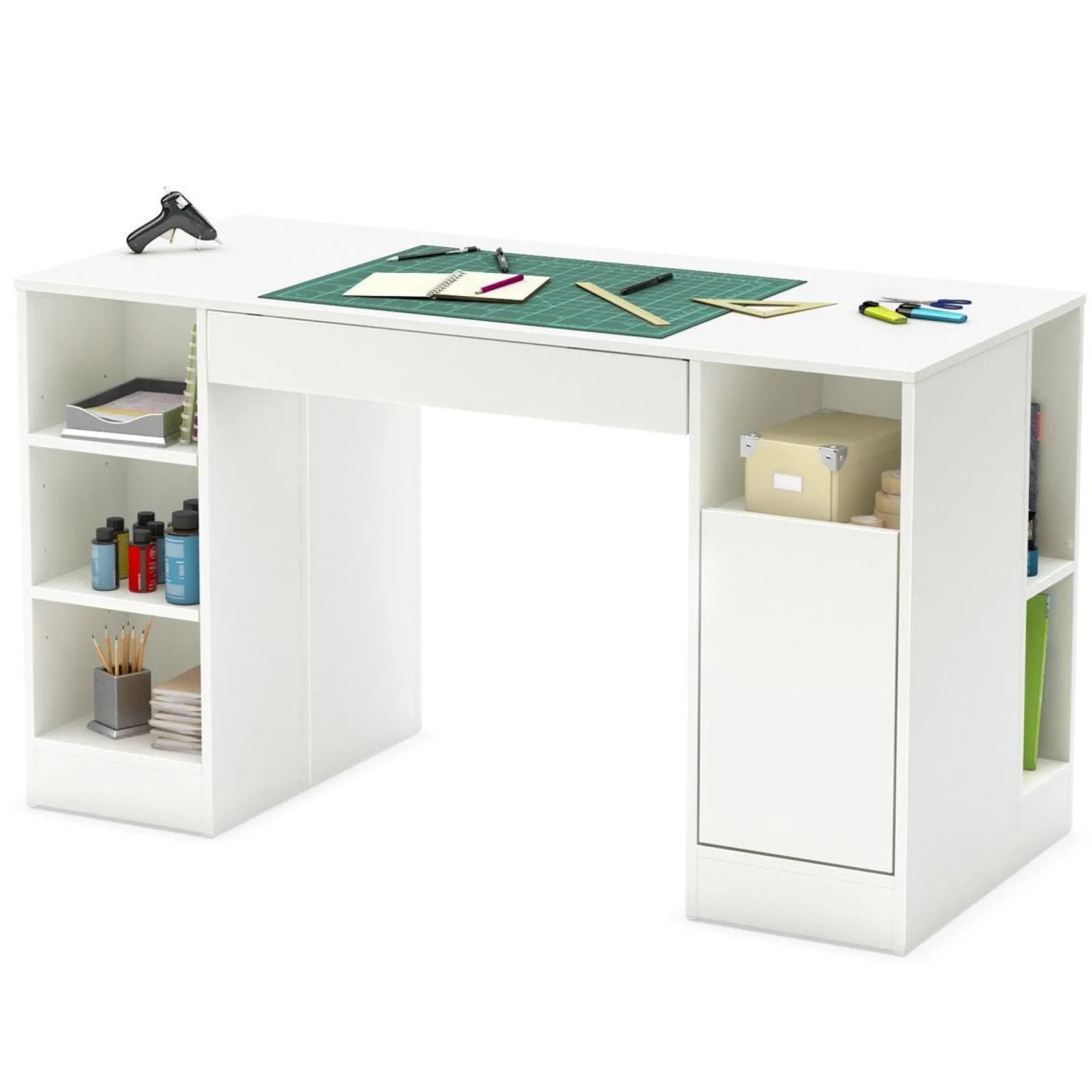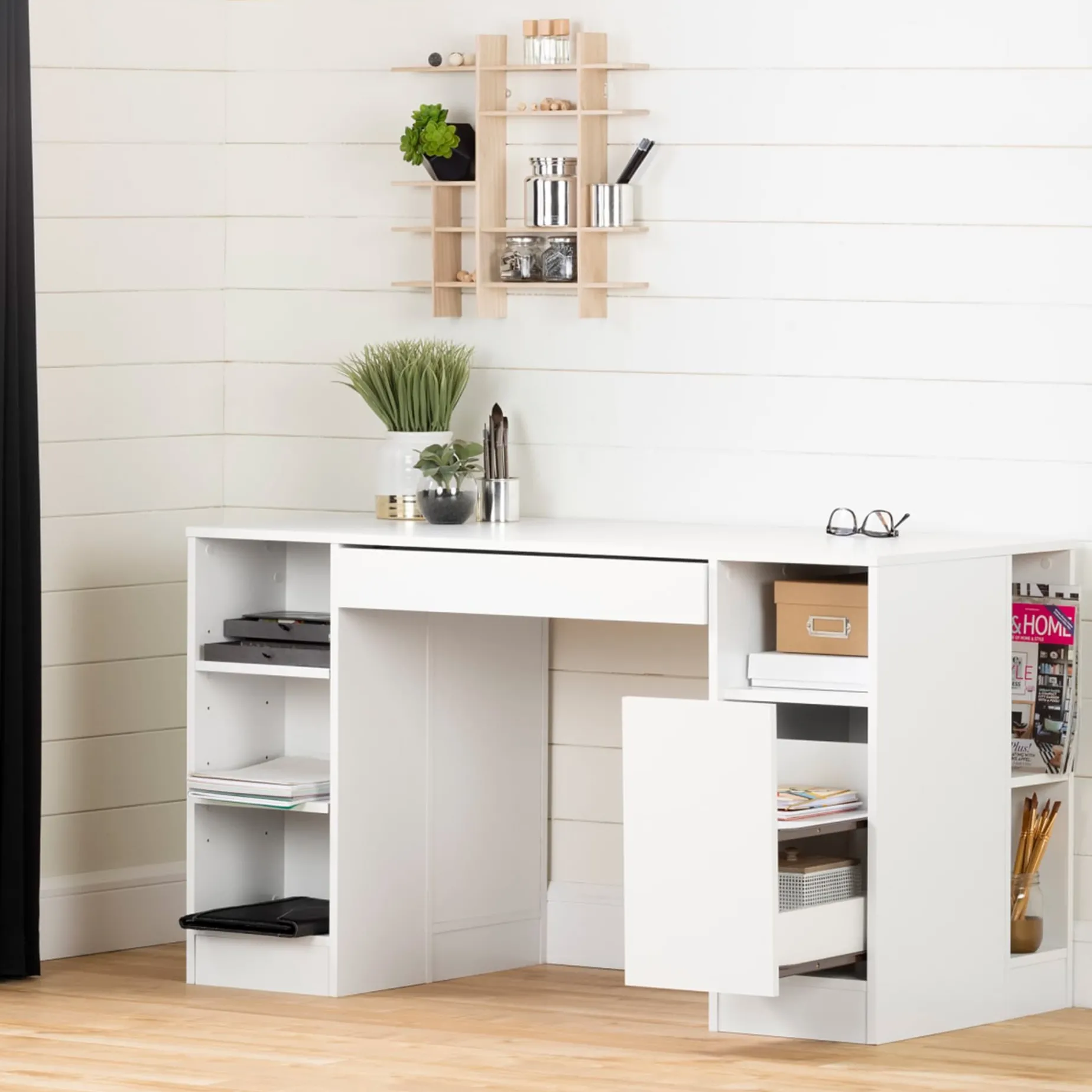 – The other module includes: (front) 1 open storage space defined by a fixed shelf and a drawer: tall front panel covers shelf that slides out for easy access; (side) 2 narrow storage spaces separated by a fixed shelf, ideal for putting away binders and magazines that you consult for inspiration