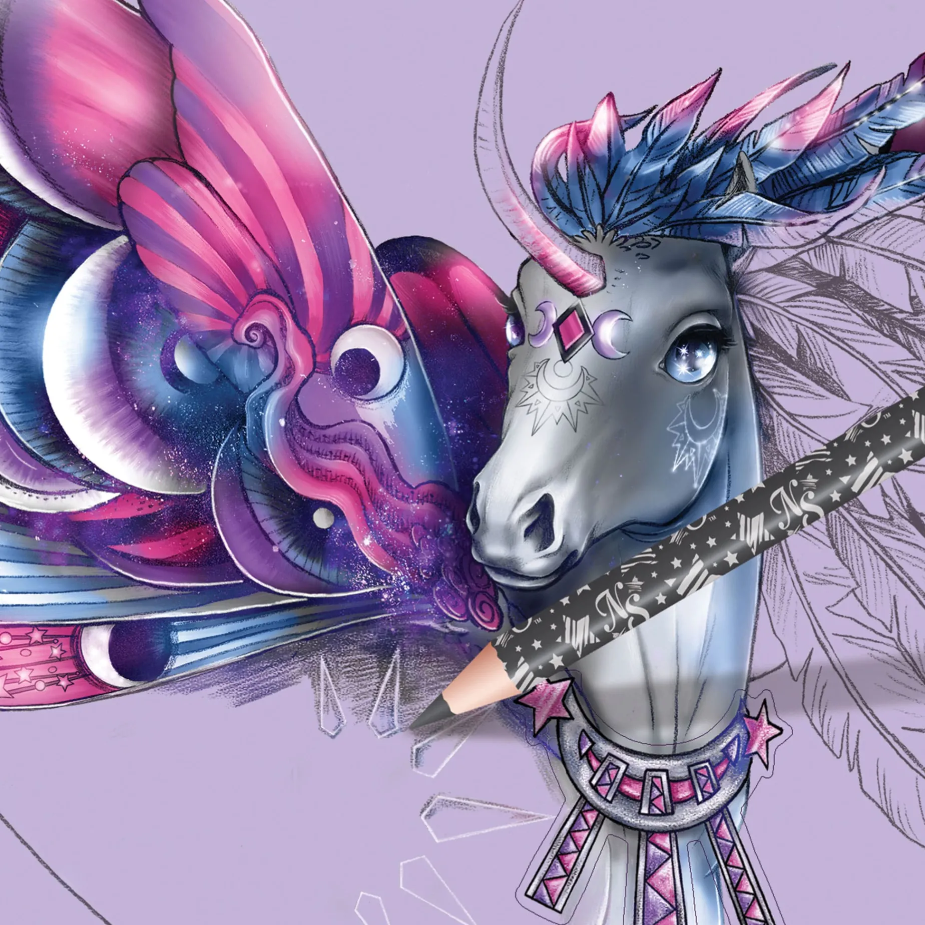 Create magical and stunning fantasy horses worthy of galloping alongside the Stars. Use an array of stickers, stencils and techniques to design the horses of your dreams.