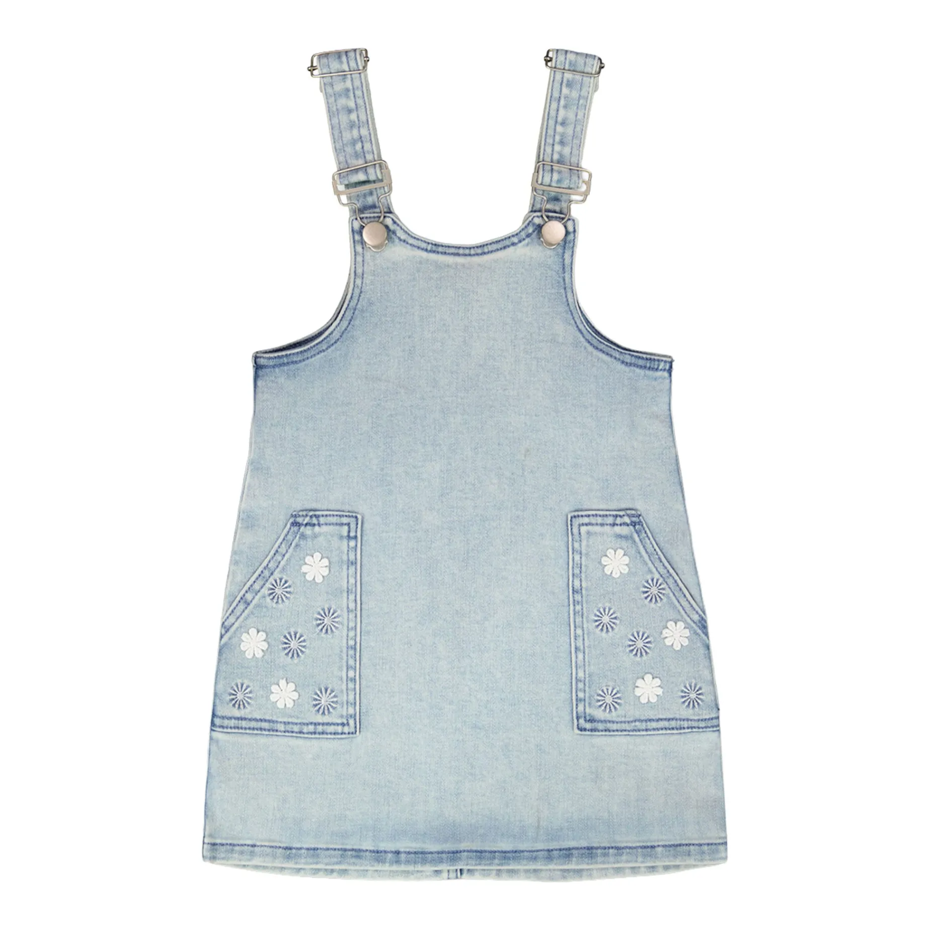 Casual yet chic, our light blue denim overall dress is a versatile piece for playful days. This sleeveless dress features adjustable buckle straps, front patch pockets with embroidered daisies, and a straight cut for effortless layering. Part of the “Explosion of Daisies” collection, it pairs beautifully with any tee or blouse from the line.