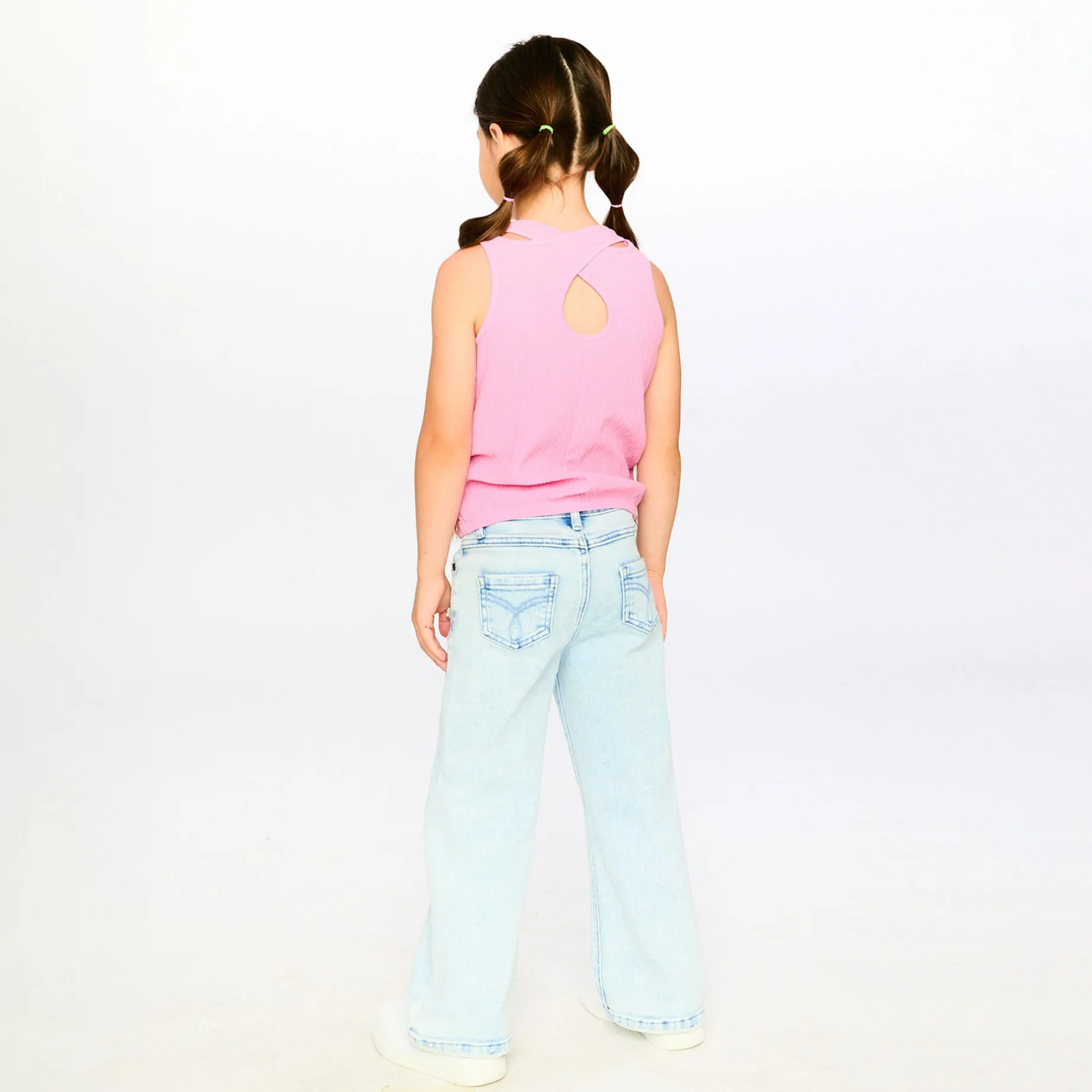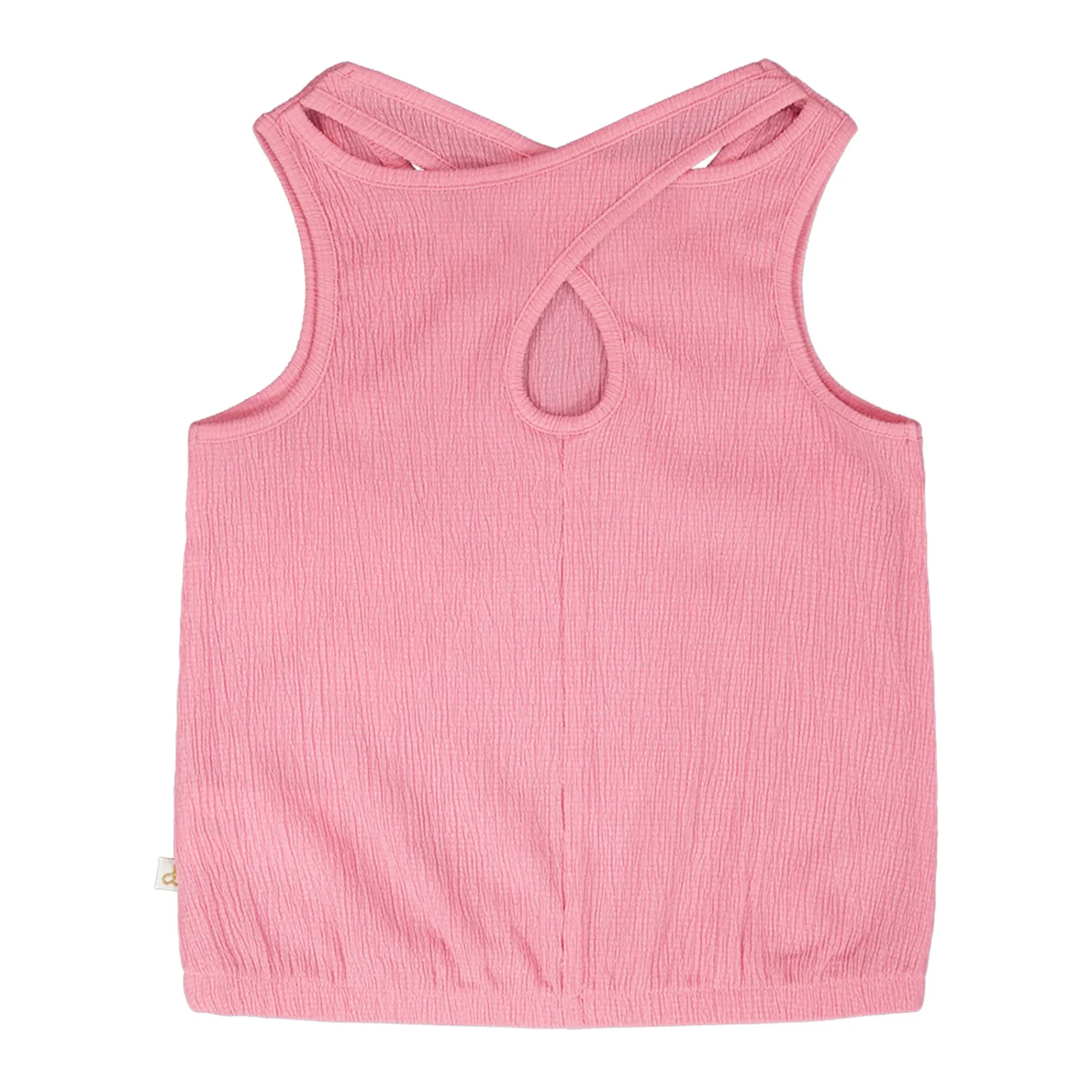 Playful and easy to wear, our crinkle jersey tank top in pink is perfect for warm days. This sleeveless camisole is crafted from soft crinkle jersey with a round neckline, a charming allover daisy print, elasticized hem for comfort, and cross straps at the back for a stylish finish. Pair it with shorts or a skirt from the “Explosion Of Daisies” collection for a breezy summer look.