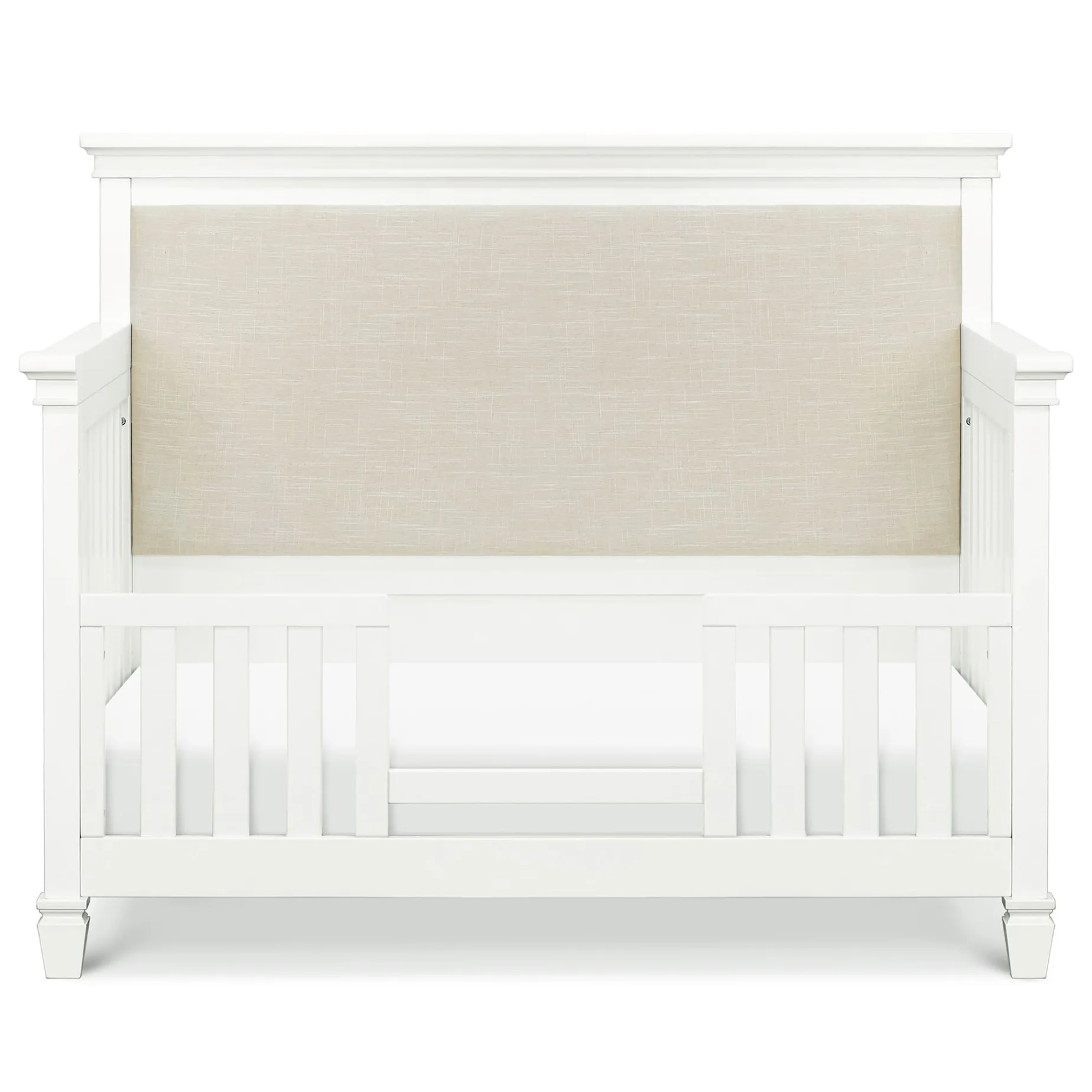 The Darlington 4-in-1 Crib brings the sophistication of relaxed French country style into the nursery. The Darlington balances delicate lines, gently detail molded tapered feet, and a lush upholstered back panel. Crib converts to a toddler bed, daybed, and full-size bed.
