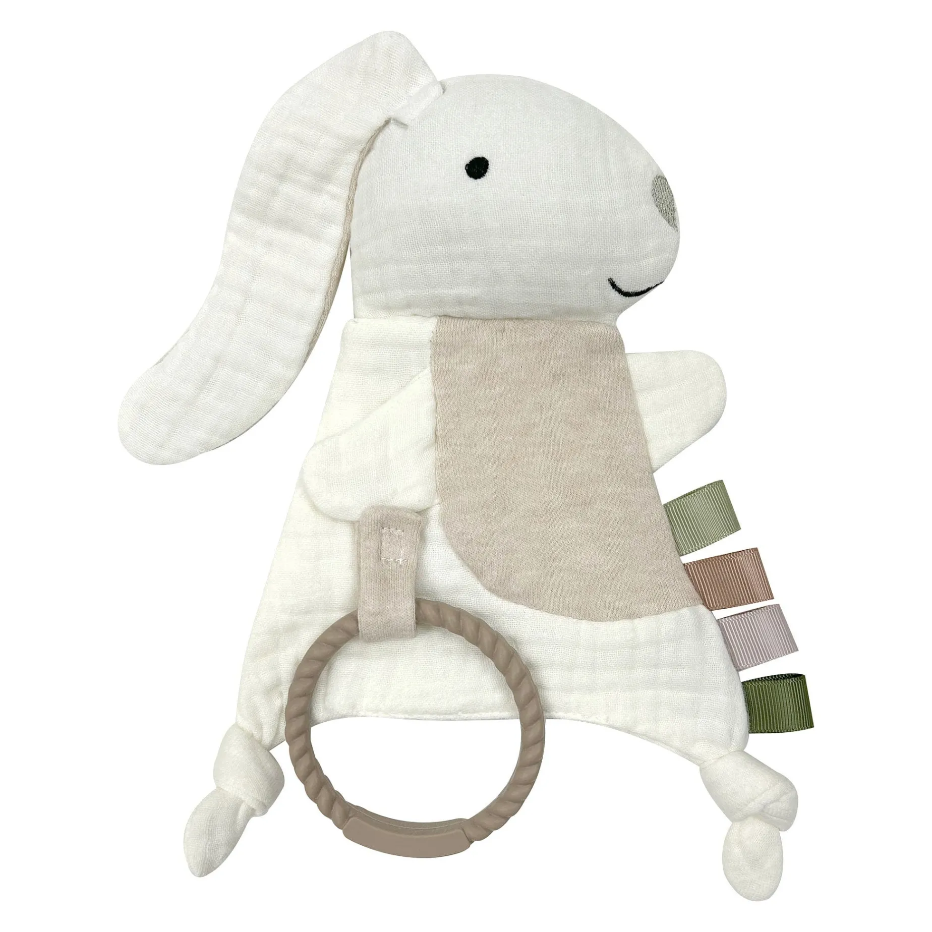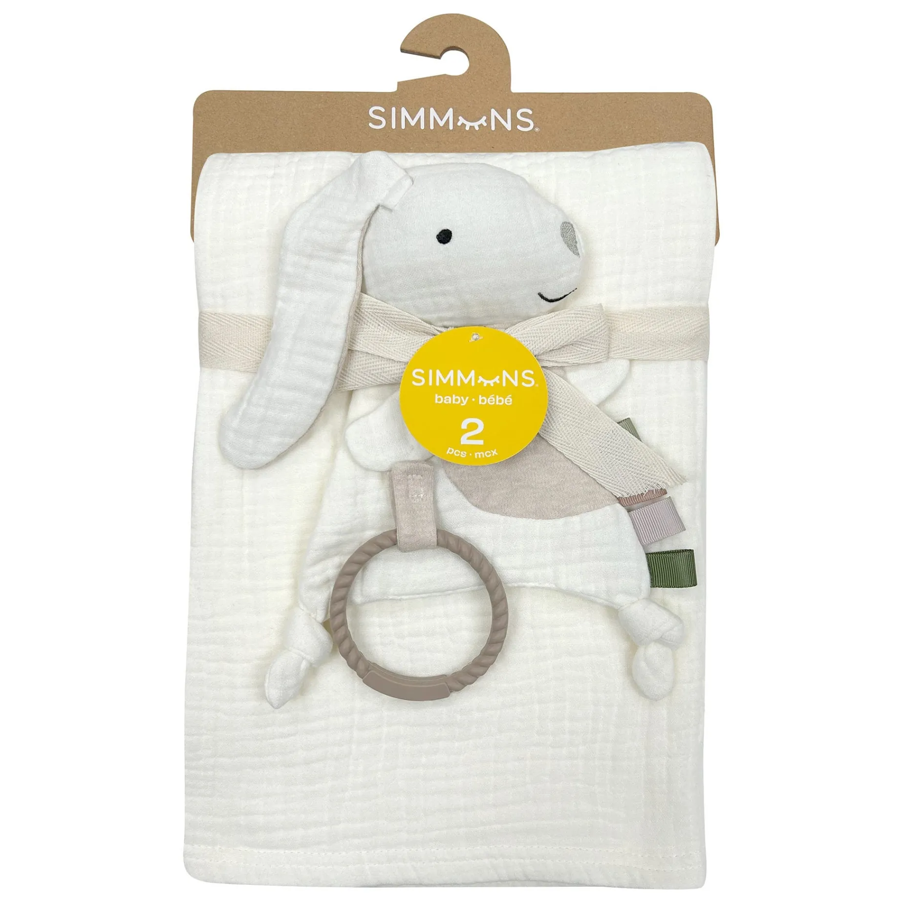 Includes a waffle-patterned muslin blanket and an interactive rabbit toy