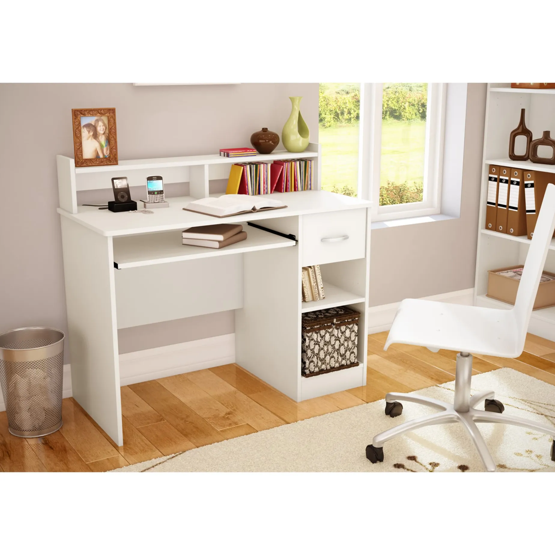 Designed to Maximize Storage This Axess Desk is the perfect answer to organizing clutter. It features a drawer and slide-out keyboard tray, plus a lower open area divided by an deep adjustable shelf. Above the desk, there’s a low hutch with a shelf. And it has a hole in the back so you can organize wires from electronics.