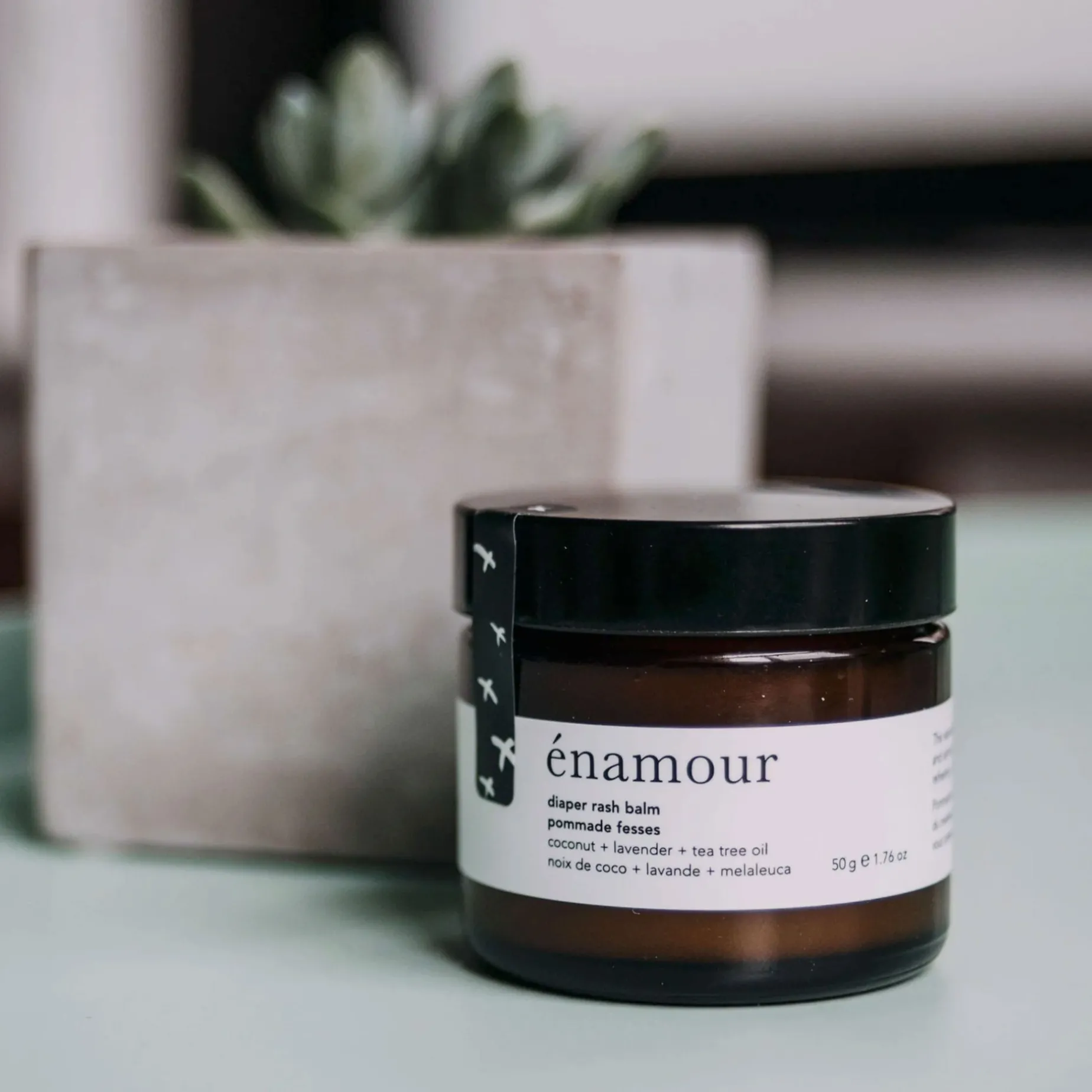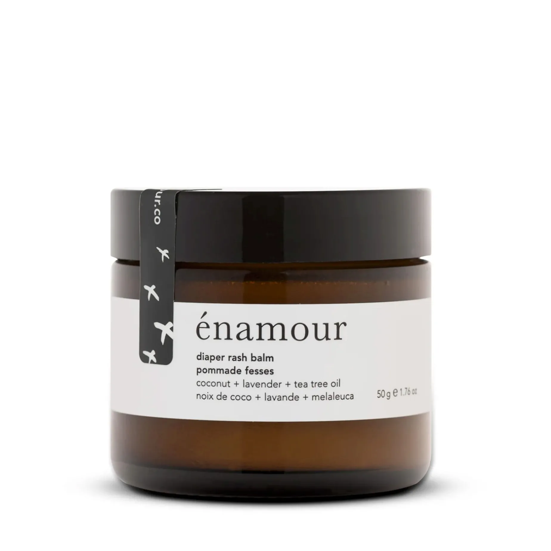 Énamour diaper rash balm is made from a base of natural coconut oil, infused with the healing properties of neem oil, soothing lavender oil and a touch of antibacterial tea tree oil. Use it generously to soothe red bottoms after a diaper change. And yes, our diaper rash balm is compatible with cloth diapers.