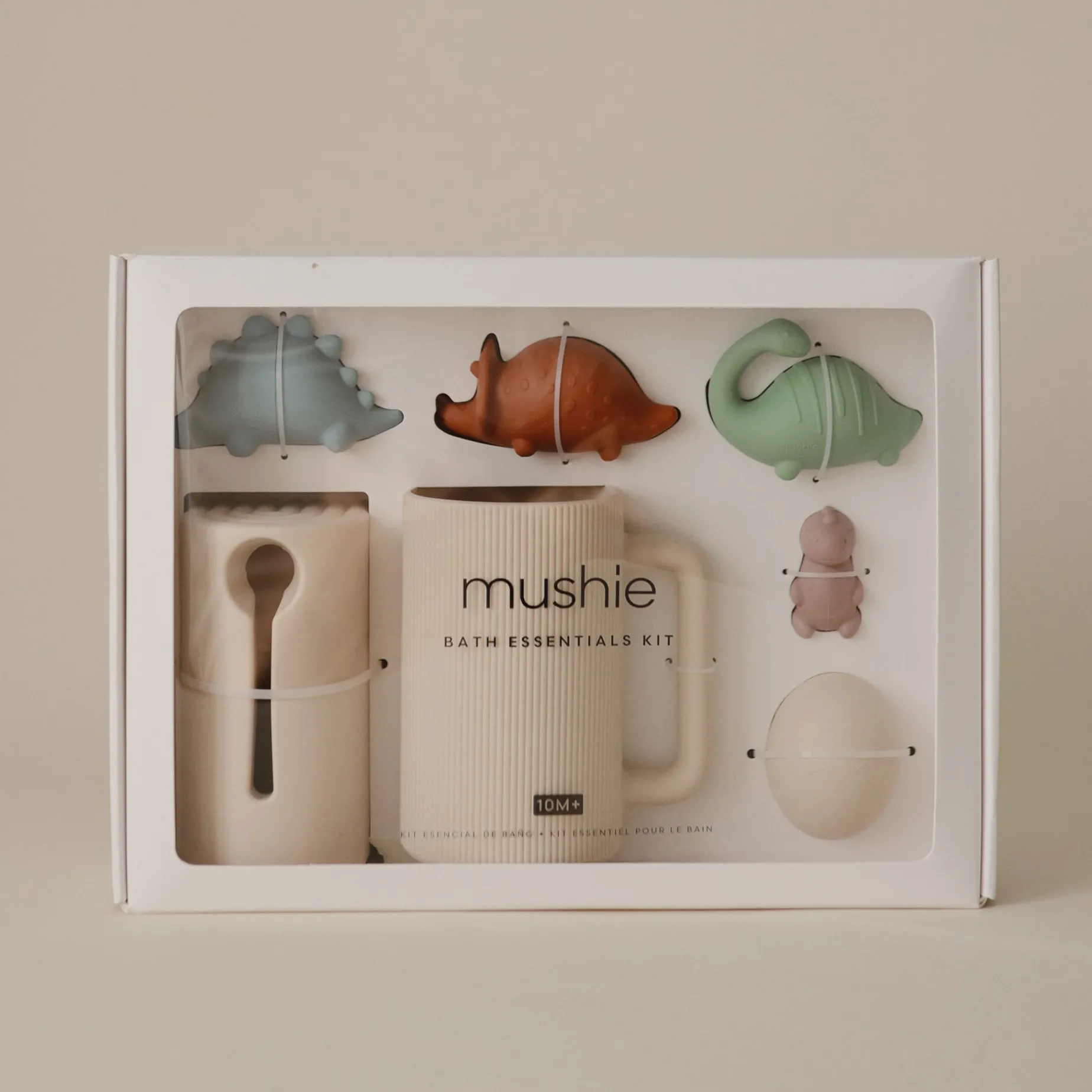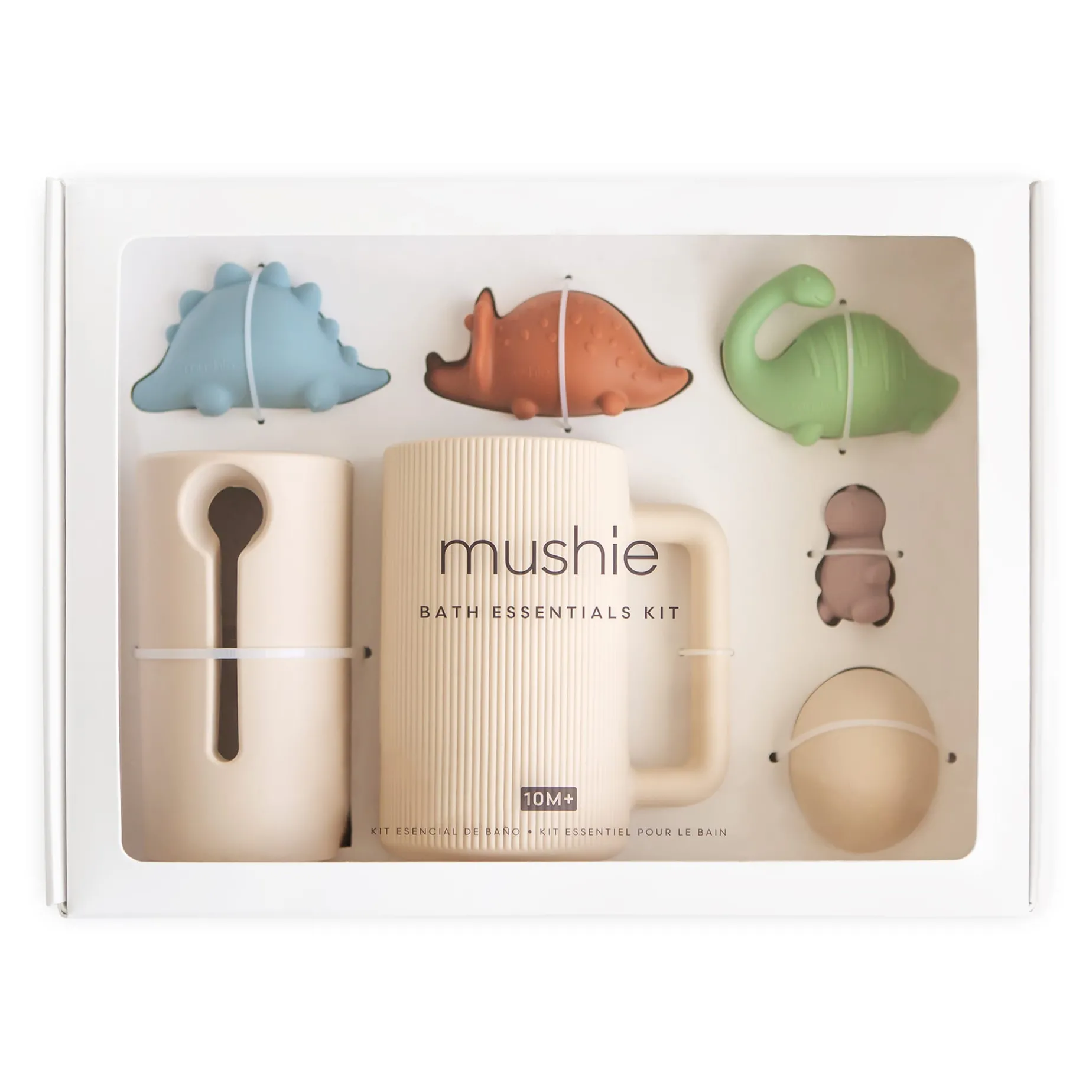Make a splash at bathtime with the Mushie dino bath play set that includes three friendly dinosaurs and an egg with adorable baby dino nestled inside. Made from 100% food grade silicone, the soft material is easy for little hands to hold while wet or dry. With its inventive design, the toys pop open into two separate pieces for thorough cleaning and fast drying. This feature allows them to remain mold-free with its easy-to-clean parts that are top-shelf dishwasher safe.