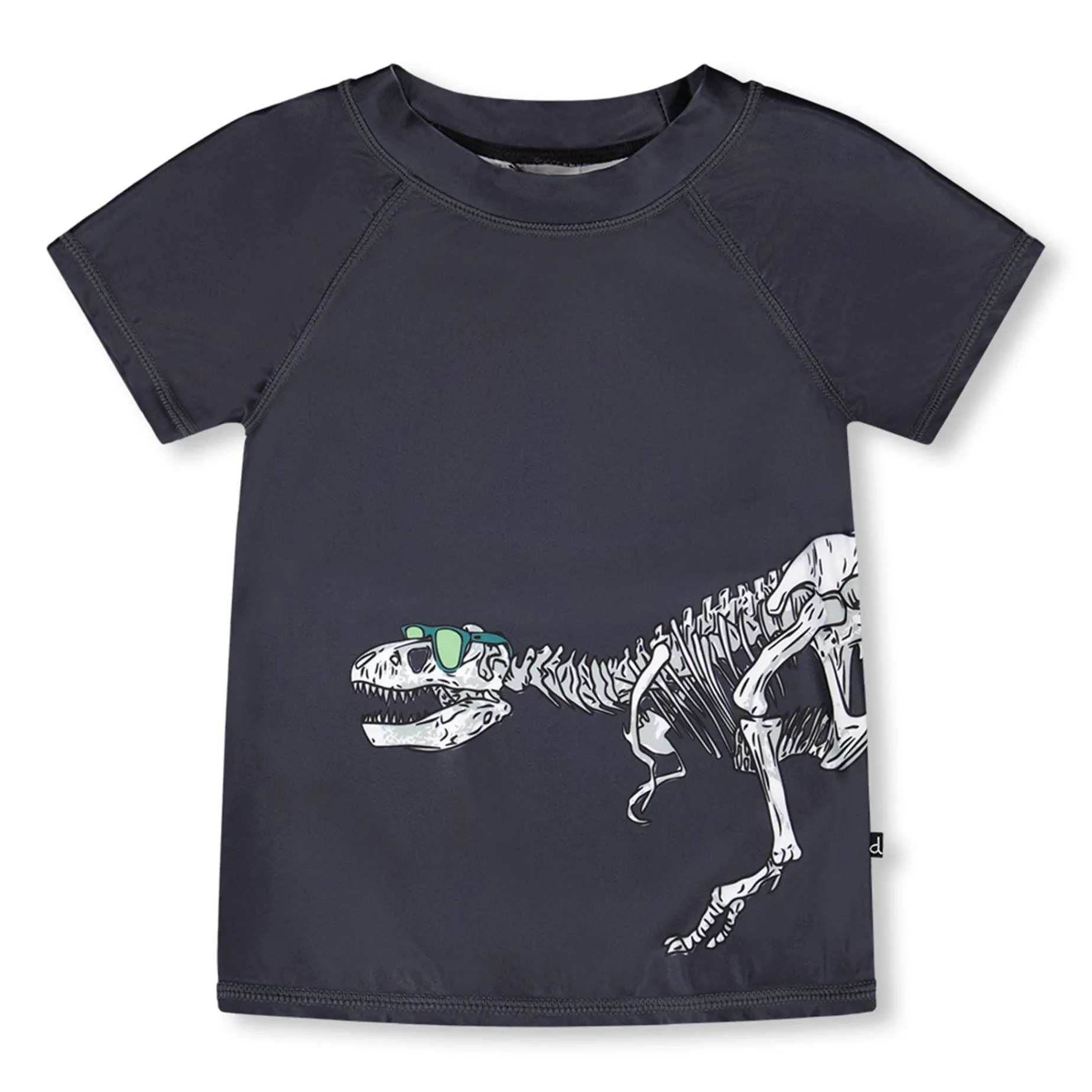 This short sleeve rashguard in black combines cool style with sun-ready protection. This swim top features short contrast sleeves and a bold front print of a dinosaur skeleton wearing sunglasses, crafted from recycled polyester with stretch for comfort and easy movement. Quick-drying and lightweight, it keeps boys comfortable during long days of water play.
