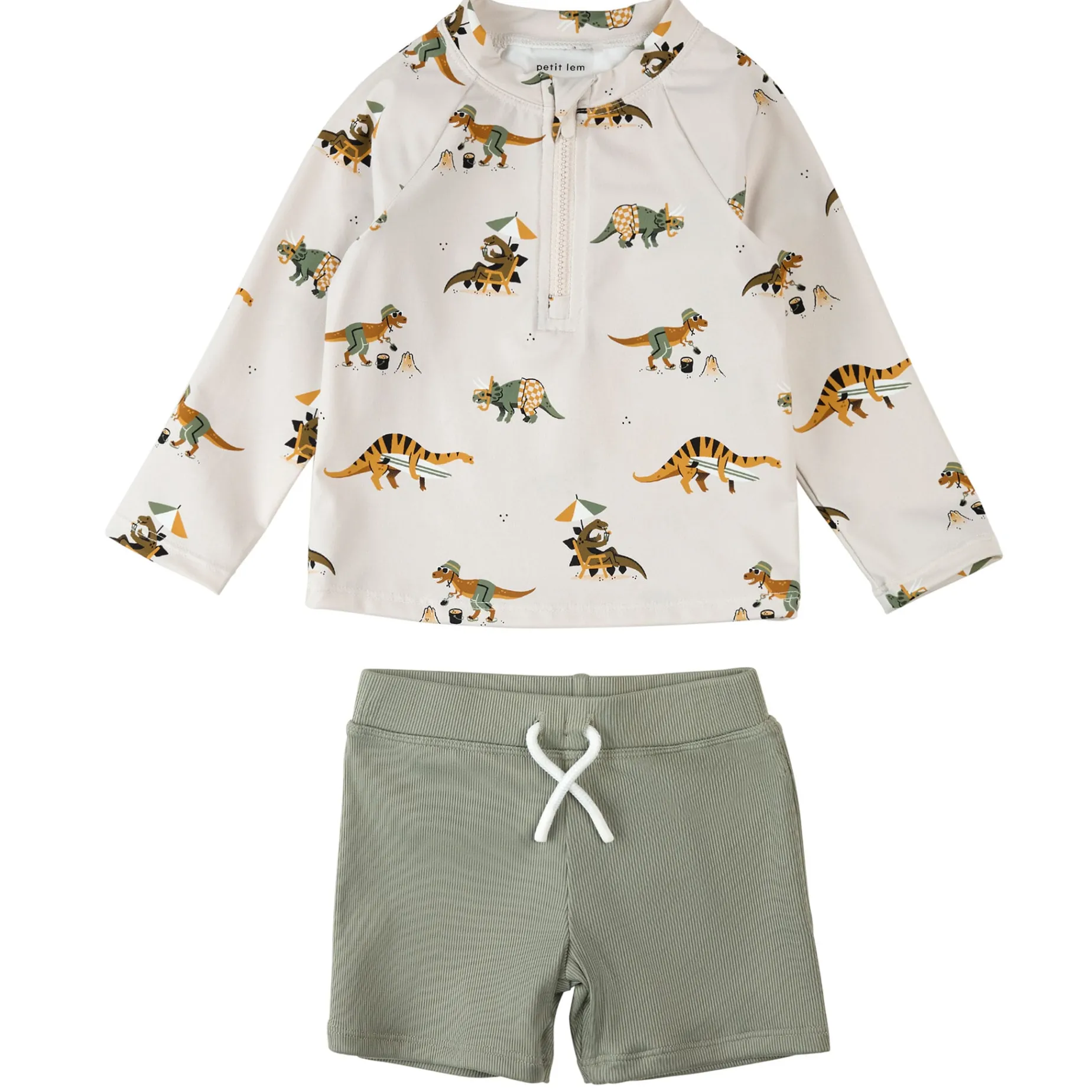Roar into summer fun with your little guy in this dinosaur print rash guard set. Perfect for little explorers, he’ll have the best day when you combine sun safety and his favourite print. The two-piece set is designed with easy-dressing features – such as the half-zip drawstring waistband – and built with quick-drying fabric and UPF50+ sun protection. He’ll enjoy all day comfort and confidence while navigating salty waters, chilly pools or hot sands.