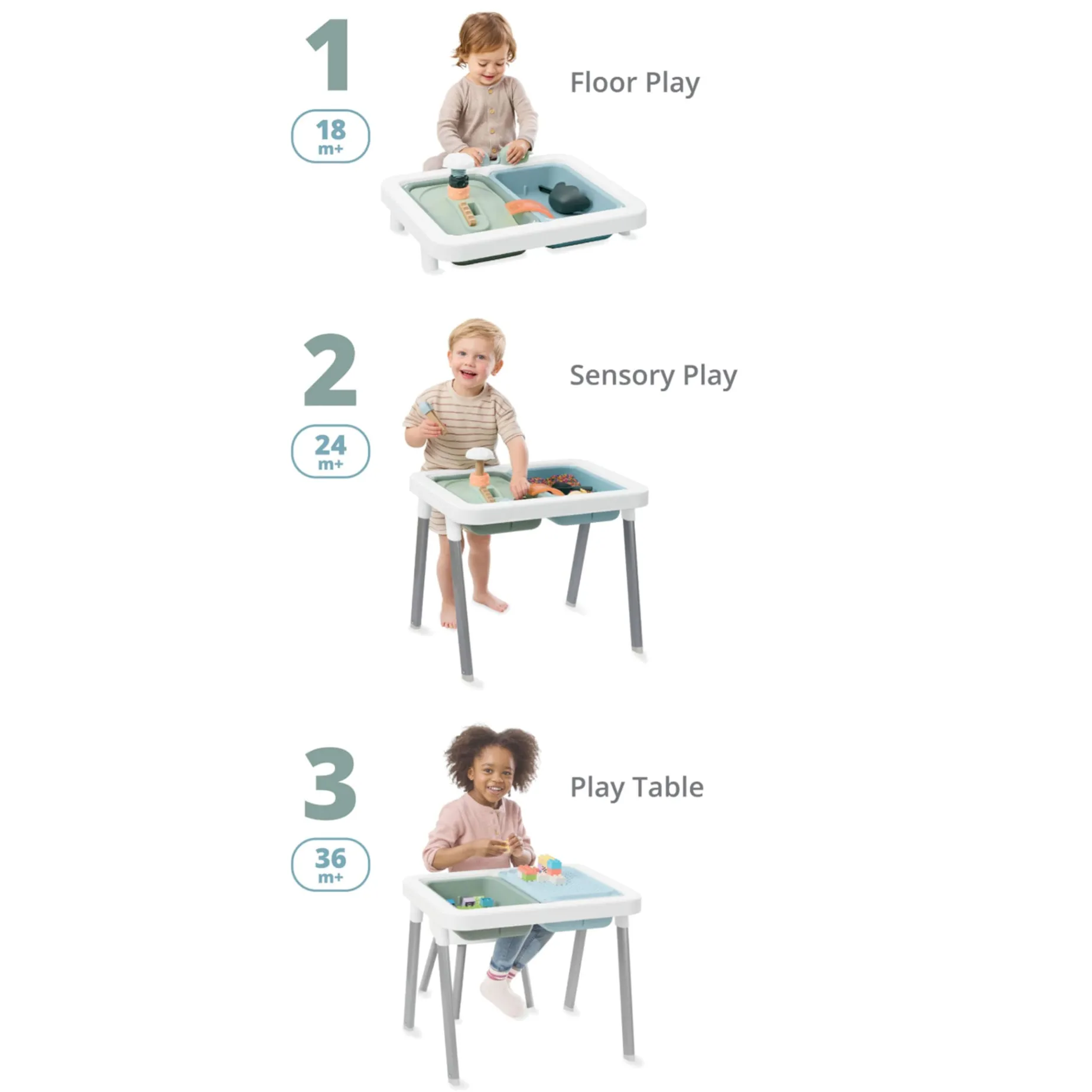 3 modes of sensory play: Floor Play (18m+), Table Play (24m+) & Play Table (36m+)