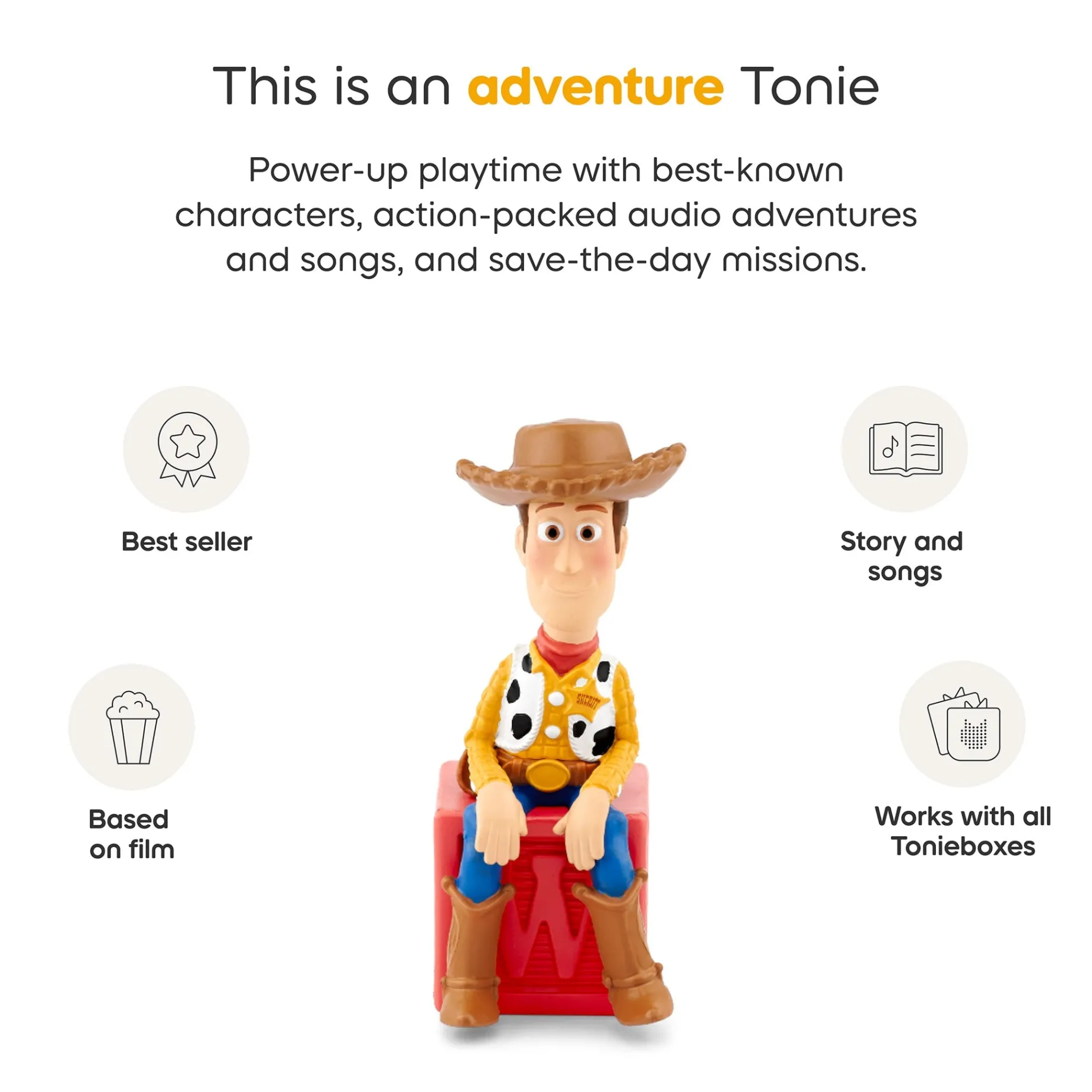 Discover the secret adventures of Woody, Buzz Lightyear and all their toy friends. Also features four songs from the animated film. This Tonie teaches: perseverance through adversity, the rewards of hard work, caring for others, navigating change, curiosity and new experiences.