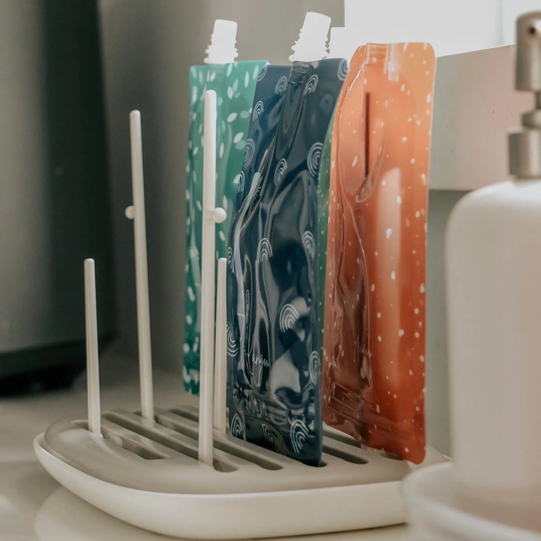 Our lovely BPA-free greige-colored drying rack is perfect for drying your reusable food pouches, bottles, bottle nipples, bottles, and other accessories.