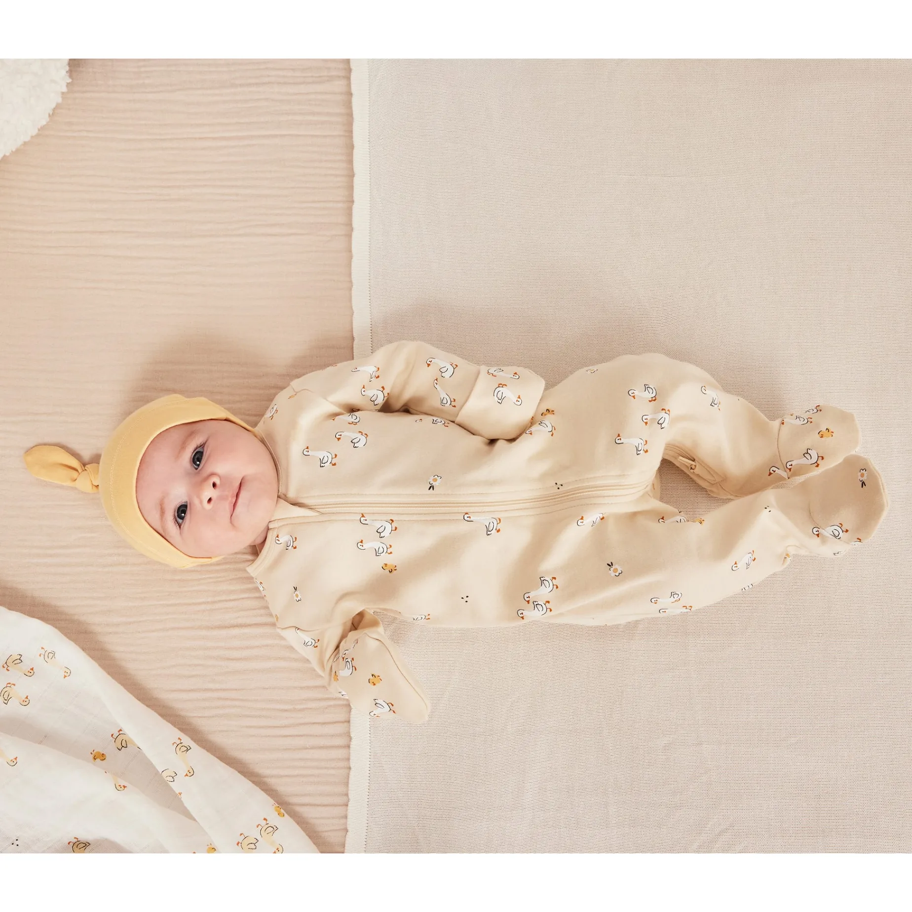 Little ones will be well bundled up for bed in this duckling patterned sleeper. Cozy and breathable, this sleeper keeps them at the ideal temperature for restful sleep. It is made from organic interlock cotton that is very soft on the skin.