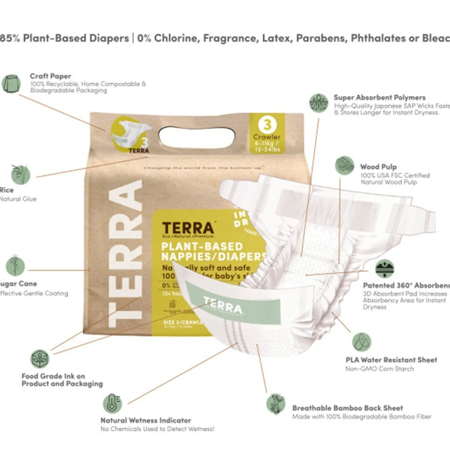 When your little one enters the world, Terra 85% Plant-Based Diapers are right there to protect their soft delicate skin from day one.