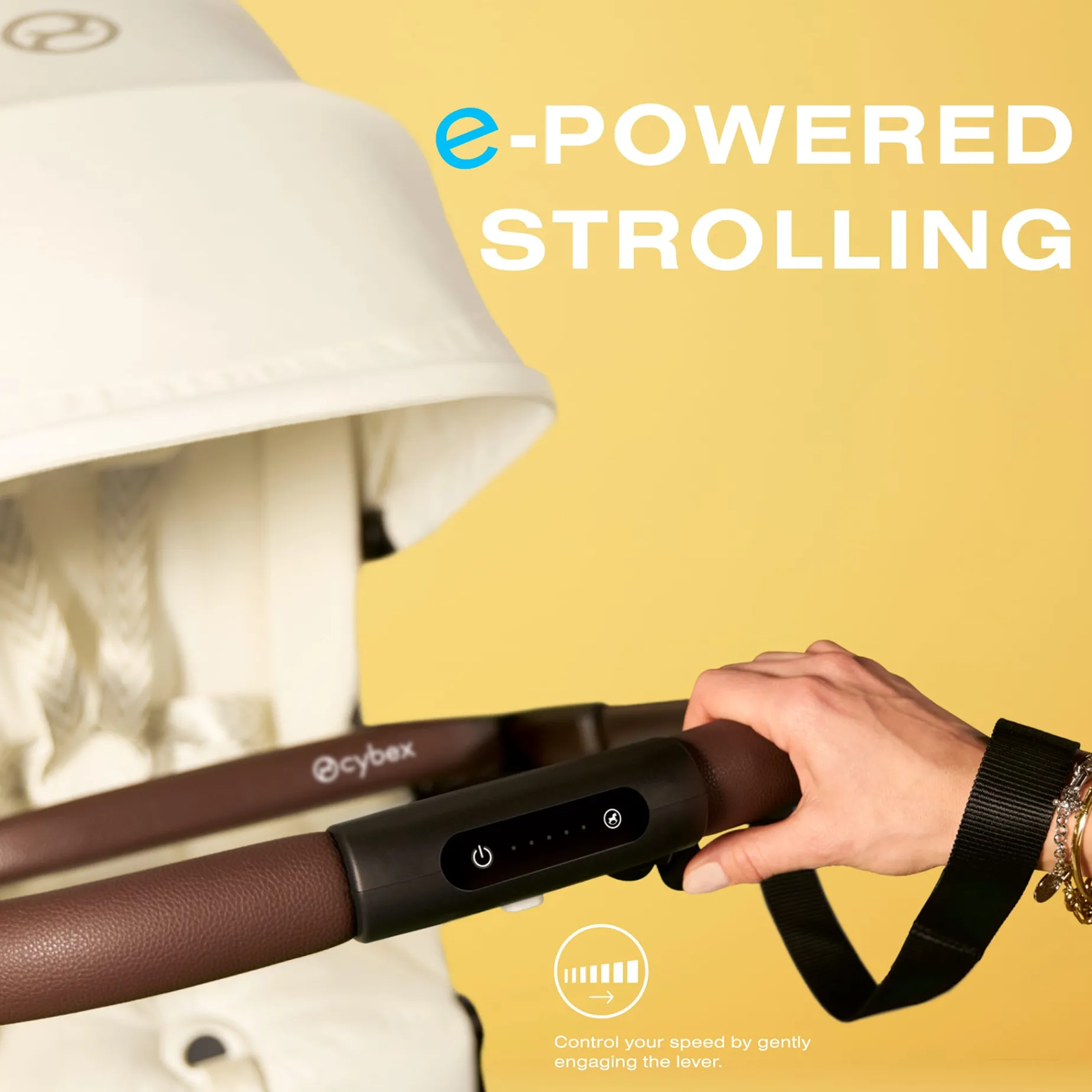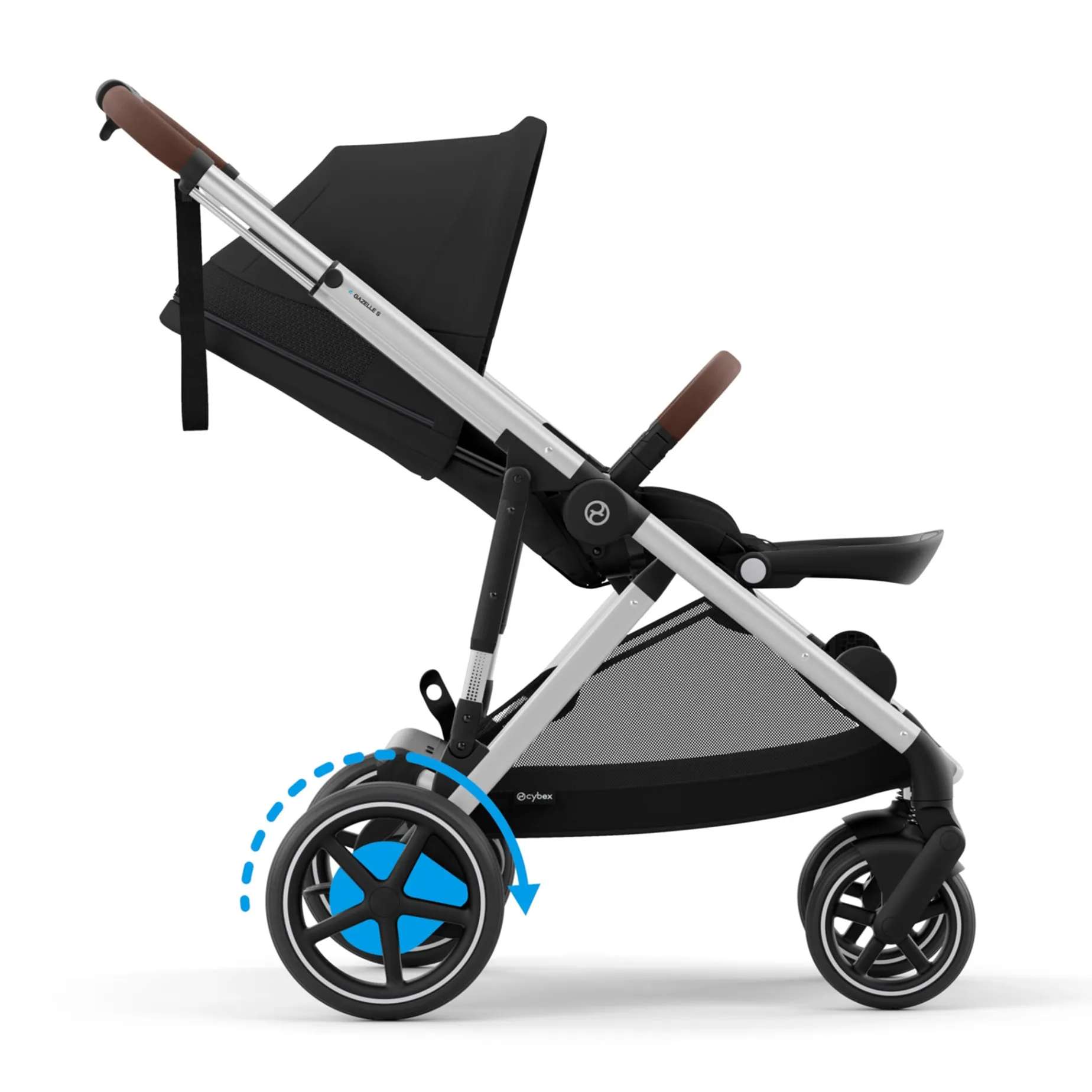 A stroller for all your adventures ahead. The CYBEX e-Gazelle stroller combines adaptability and convenience with the electric power of smart technology. Conquer any uphill climb or downhill descent and cruise through any uneven terrain effortlessly with the assistance of our electronic power on demand. Adapting to the changing needs of your family, the e-Gazelle is designed to support 20+ different configurations and easily converts from a single to double stroller. Whatever your plans are for the day, you can rely on the shopping basket and spacious lower basket for up to 55lbs. of groceries or any essentials for the journey ahead. After a long busy day, use our gentle rocking feature to help calm and soothe your child.