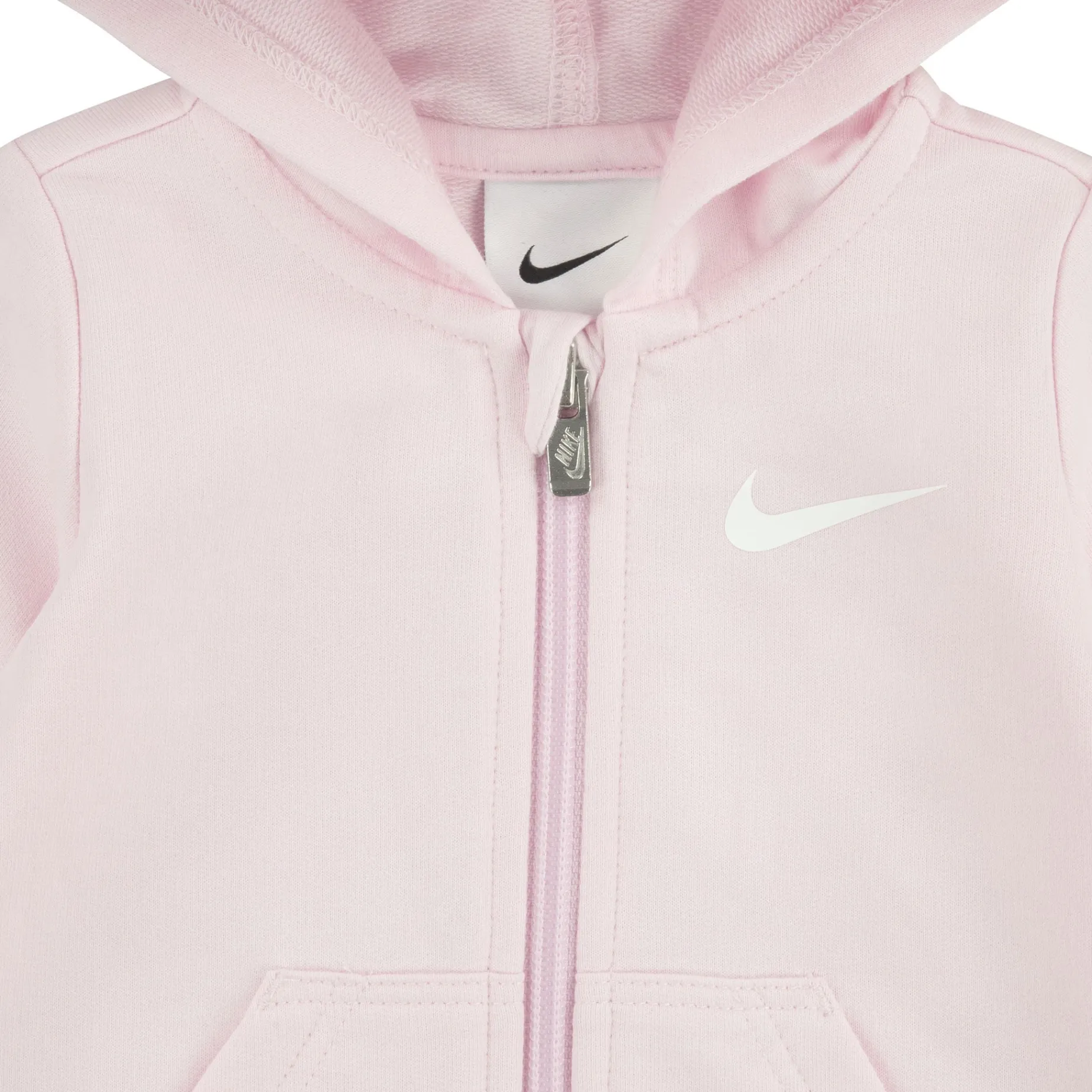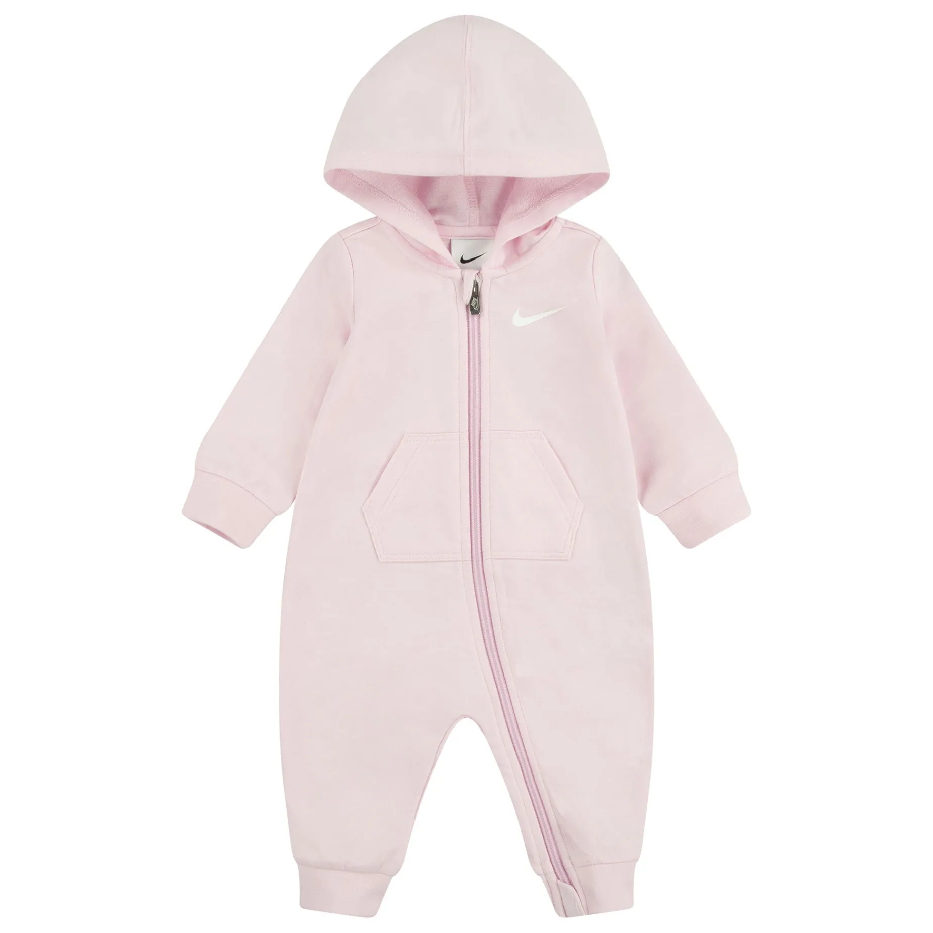 Keep your baby cozy in this soft terry coverall with a hood and kangaroo pocket. The full zipper and ribbed cuffs ensure easy dressing and warmth. Features a Nike logo.