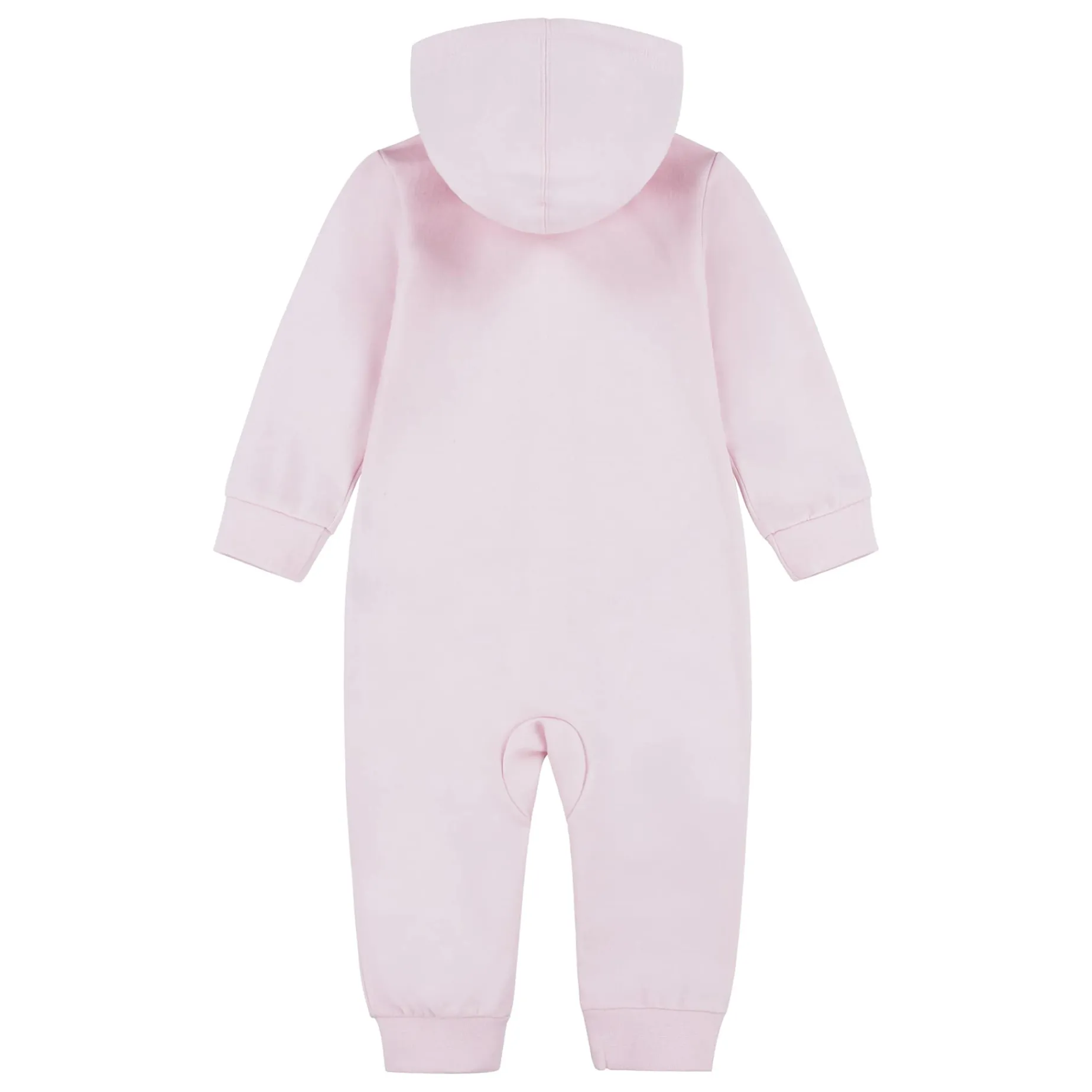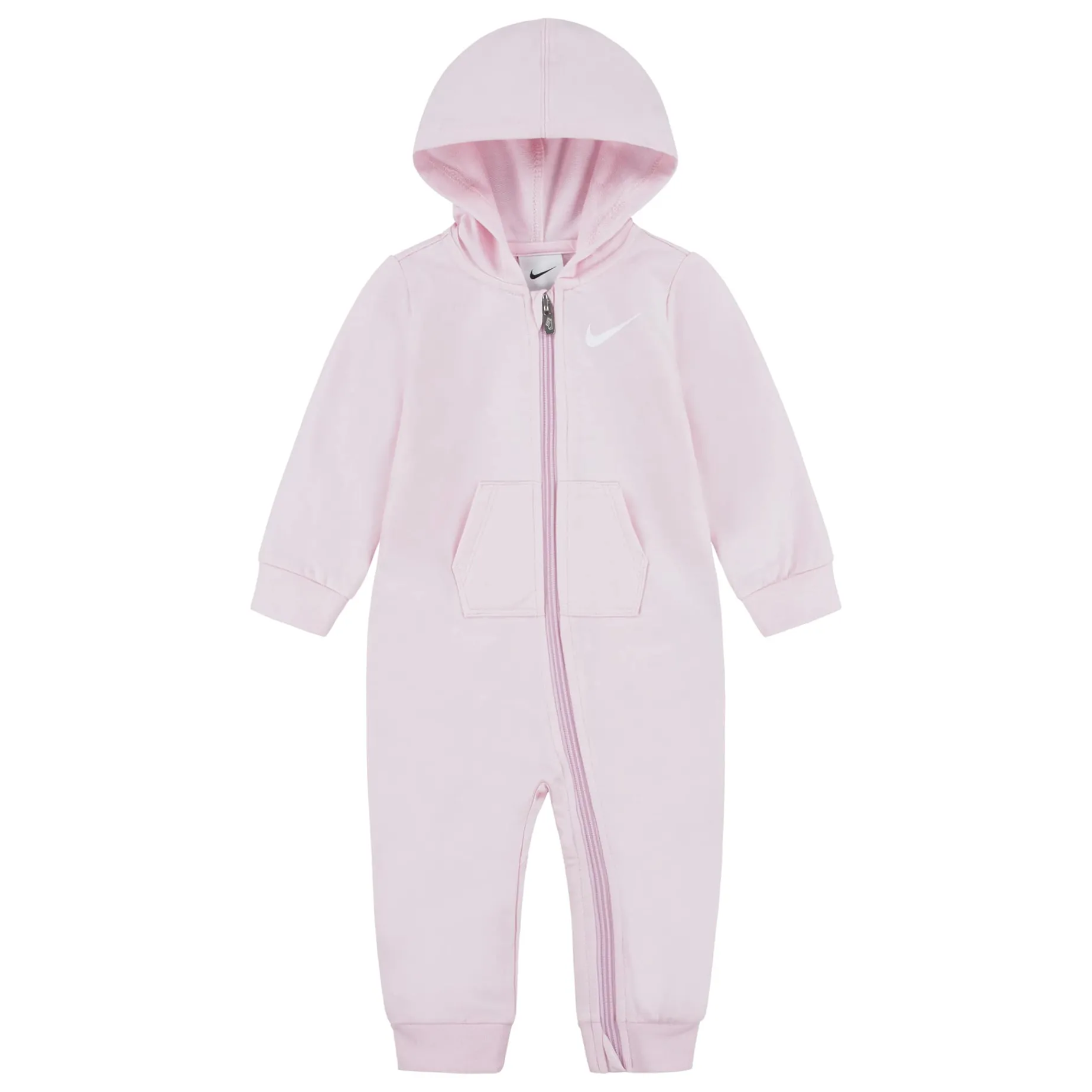 Keep your baby cozy in this soft terry coverall with a hood and kangaroo pocket. The full zipper and ribbed cuffs ensure easy dressing and warmth. Features a Nike logo.