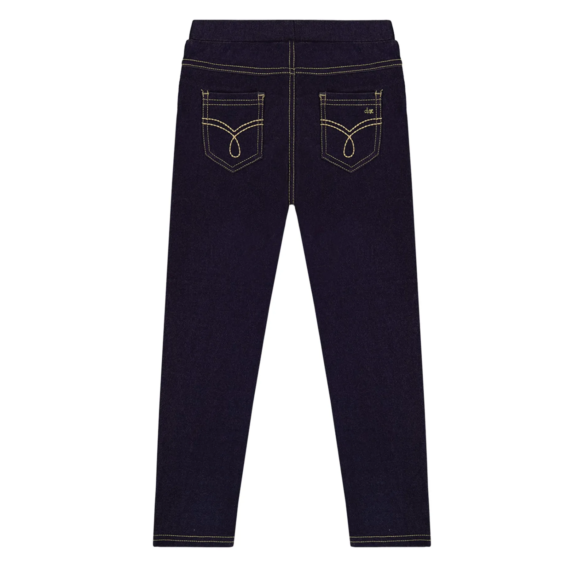 The navy blue denim jeggings are a stylish staple with the look of jeans and the comfort of leggings. These bottoms feature a slim fit, front pockets, and two jeans-style back pockets, all paired with a comfy elastic waistband. Made from a soft viscose blend with added stretch, they bring style, comfort, and practicality to girls and baby girls.