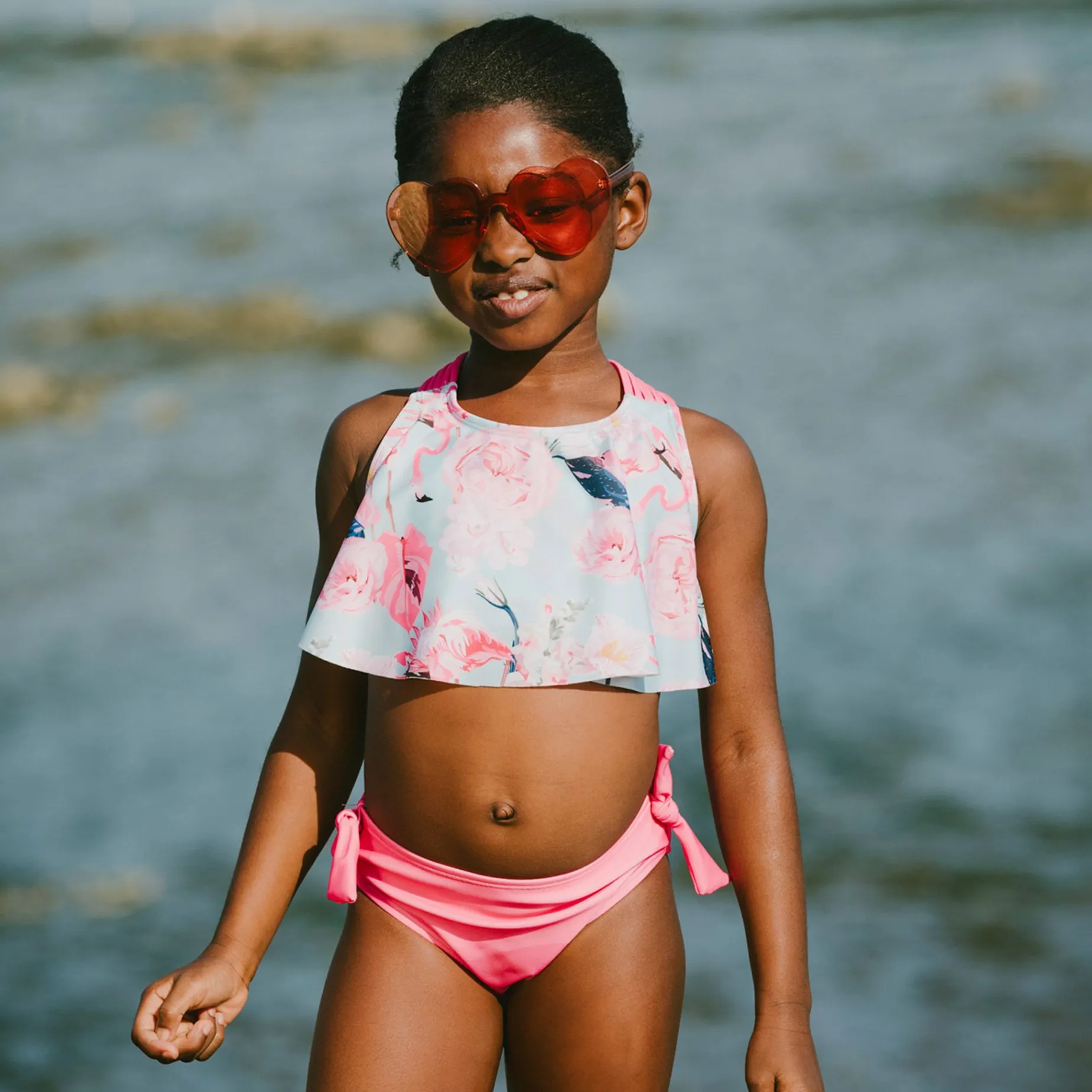 Chic and breezy, this two-piece swimsuit in blue with flamingo print is perfect for splashing around in style. This two-piece set features a flounce top with a wide ruffle, intricate triple straps at the back, and a macramé detail for a playful touch. The solid pink bikini bottom completes the look with adjustable side ties for added comfort.