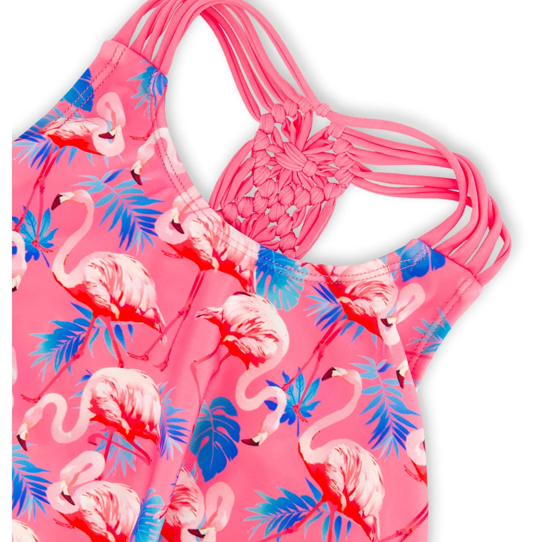 Offering a bold tropical style, our candy pink flamingo print two-piece swimsuit is a must-have for the spring and summer seasons! This adorable swimsuit has a ruffled top with multi-string straps, a macrame accent at the back, and a scoop neck. We paired it with coordinating solid pink bikini bottoms with flamingo print side ties.