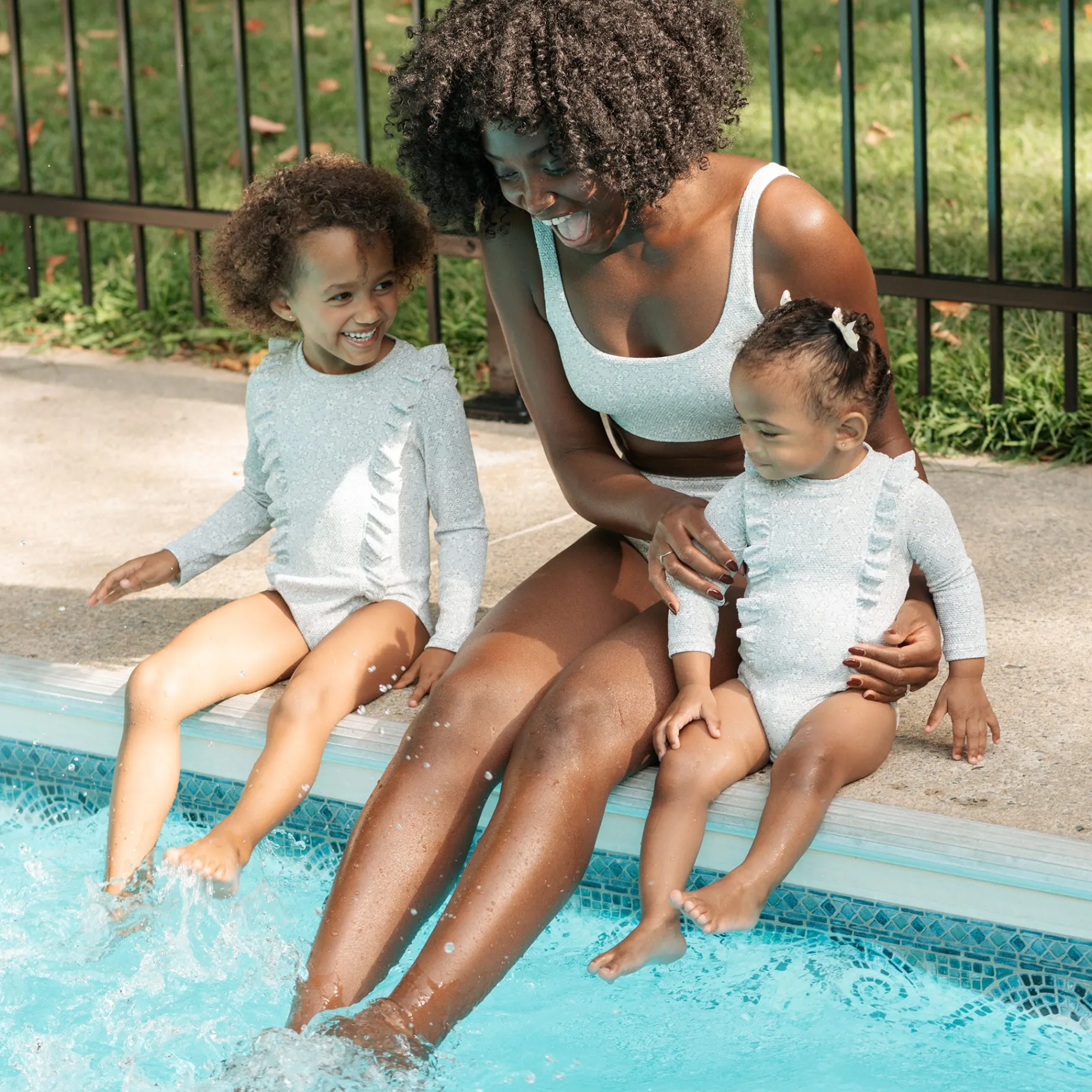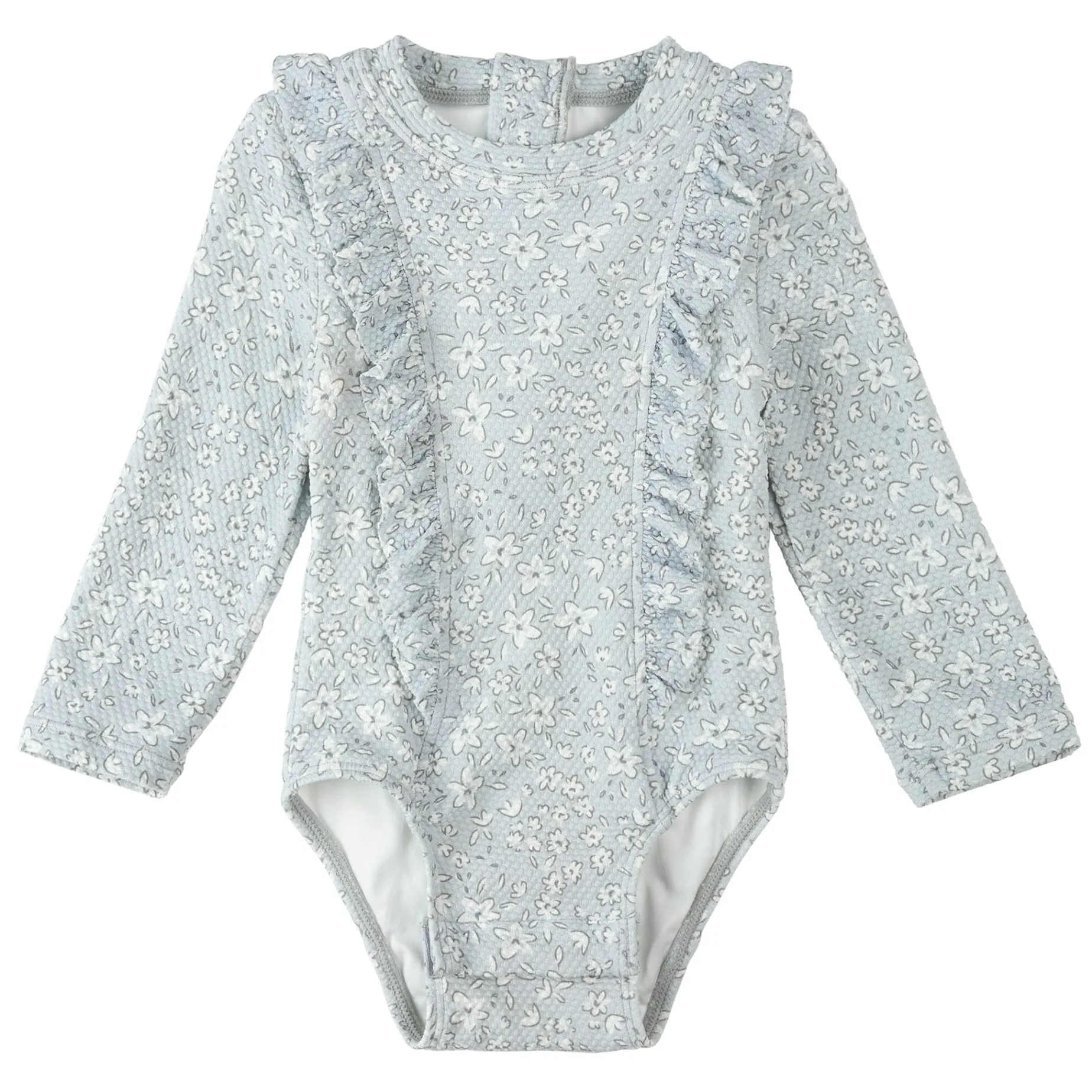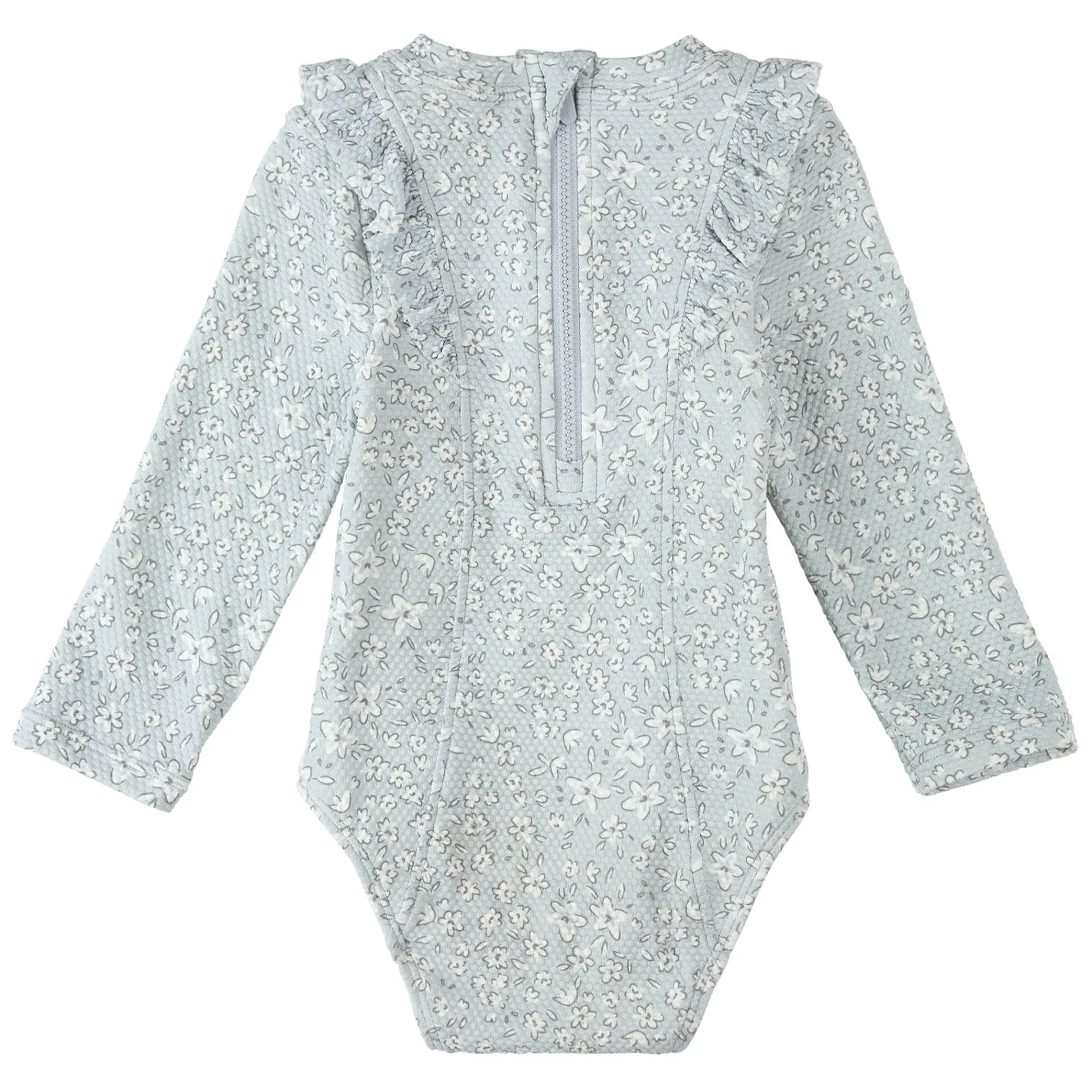 Fresh and floral, this pastel blue one-piece offers a charming vintage style for summer days by the water. With long sleeves and built-in UPF50+, the piece allows her to stay covered up and comfortable in the sun. Made from a quick-drying, waffle textured fabric, the piece has all the flexibility she needs to splash, wiggle, dive and giggle. A zip at the back makes dressing simple so she can switch from water to playtime in no time at all.