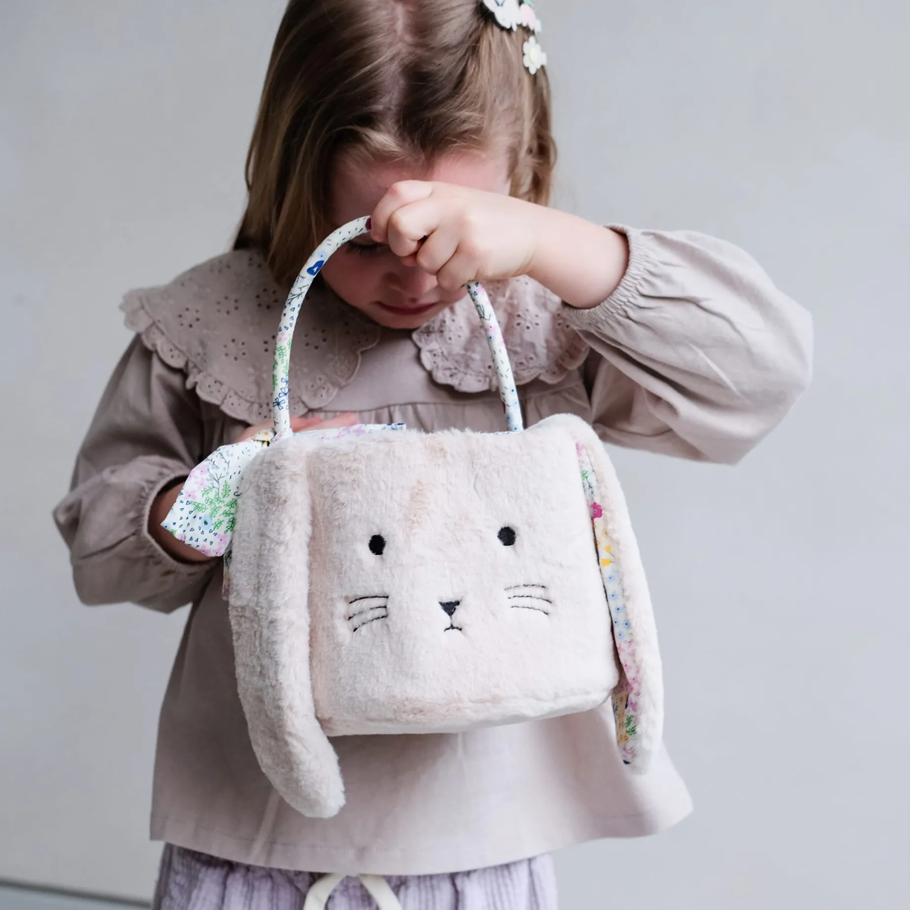 Crafted from the softest, floral lined fur fabric complete with floppy ears, carry handle and hand tied bow with a sweet embroidered bunny face and a pom pom tail!
