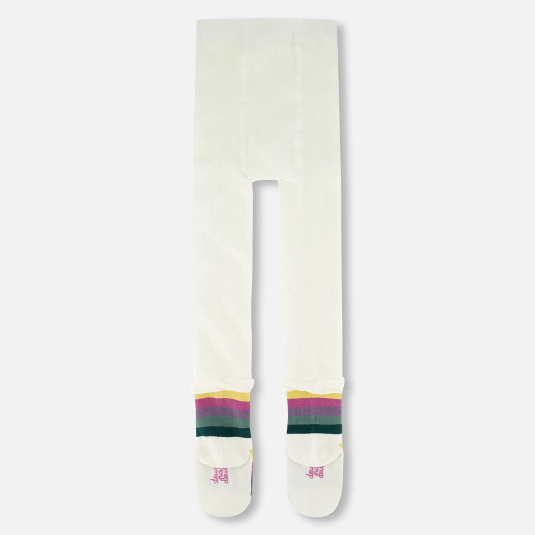 Add a playful twist to any outfit with our Striped Footed Knit Tights in Off-White. These girly tights are made from a soft cotton blend with stretch, featuring colorful horizontal stripes on the feet topped with a delicate ruffle trim, and a snug fit through the leg. Perfect for layering under dresses or skirts, they bring warmth, comfort, and charm all season long.