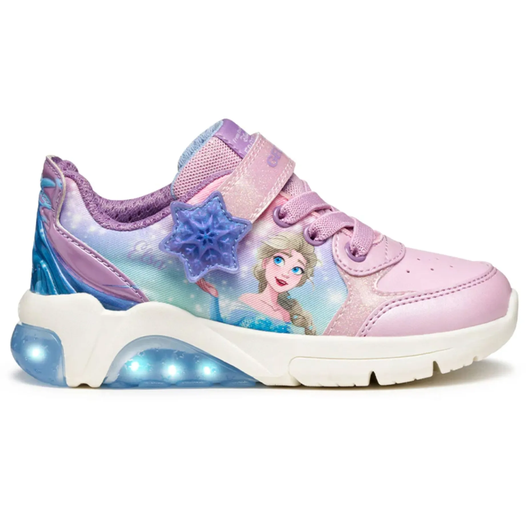 Sneaker for girls with a modern playful design that includes fun lights built into the sole for a bright and original look. This version has been crafted from a printed fabric and pearlescent leather-effect material in a pink palette and oozes all appeal of the partnership between Geox and Disney Frozen. Fadinlight is the ultimate solution for little girls’ busy days and will energise their day-to-day dressing with a magical touch and active energy.