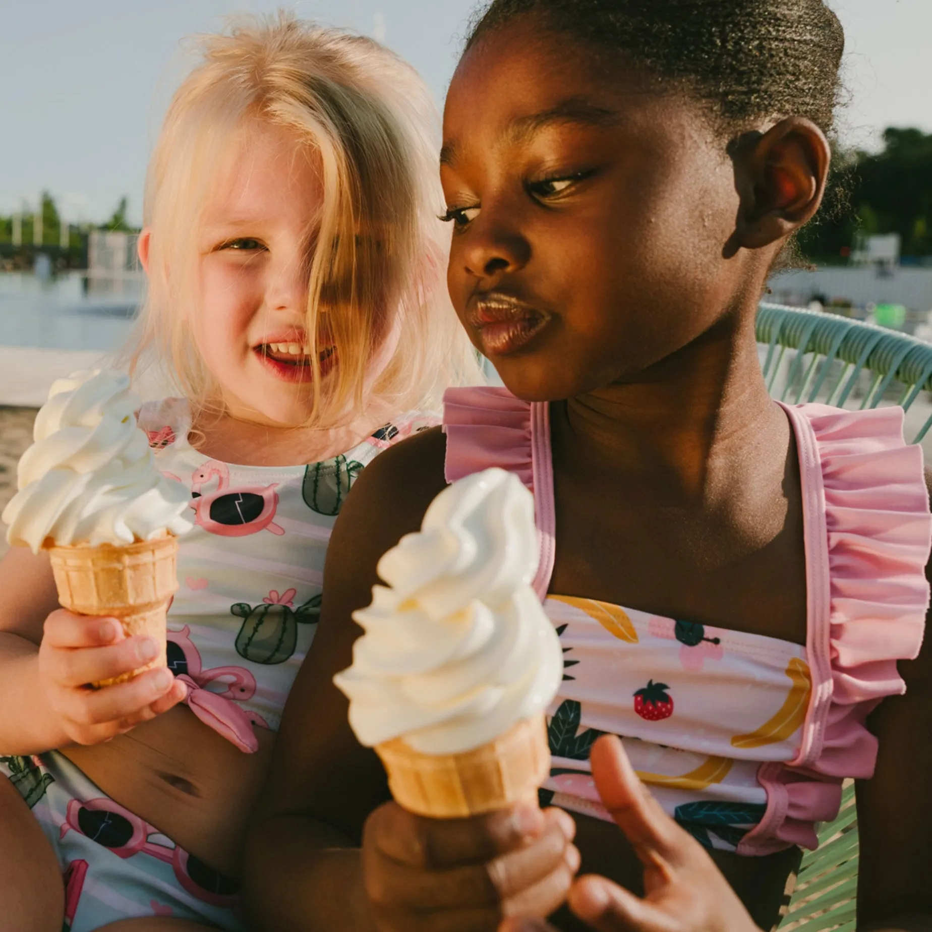 The two-piece swimsuit in pink with printed fruits is a playful choice for sunny days. This bikini set features a fruit print with pineapples, bananas, and watermelons, while the top is enhanced with wide ruffled straps for a fun and feminine look. Made from recycled polyester with added stretch, it blends comfort, durability, and charm for beach adventures.