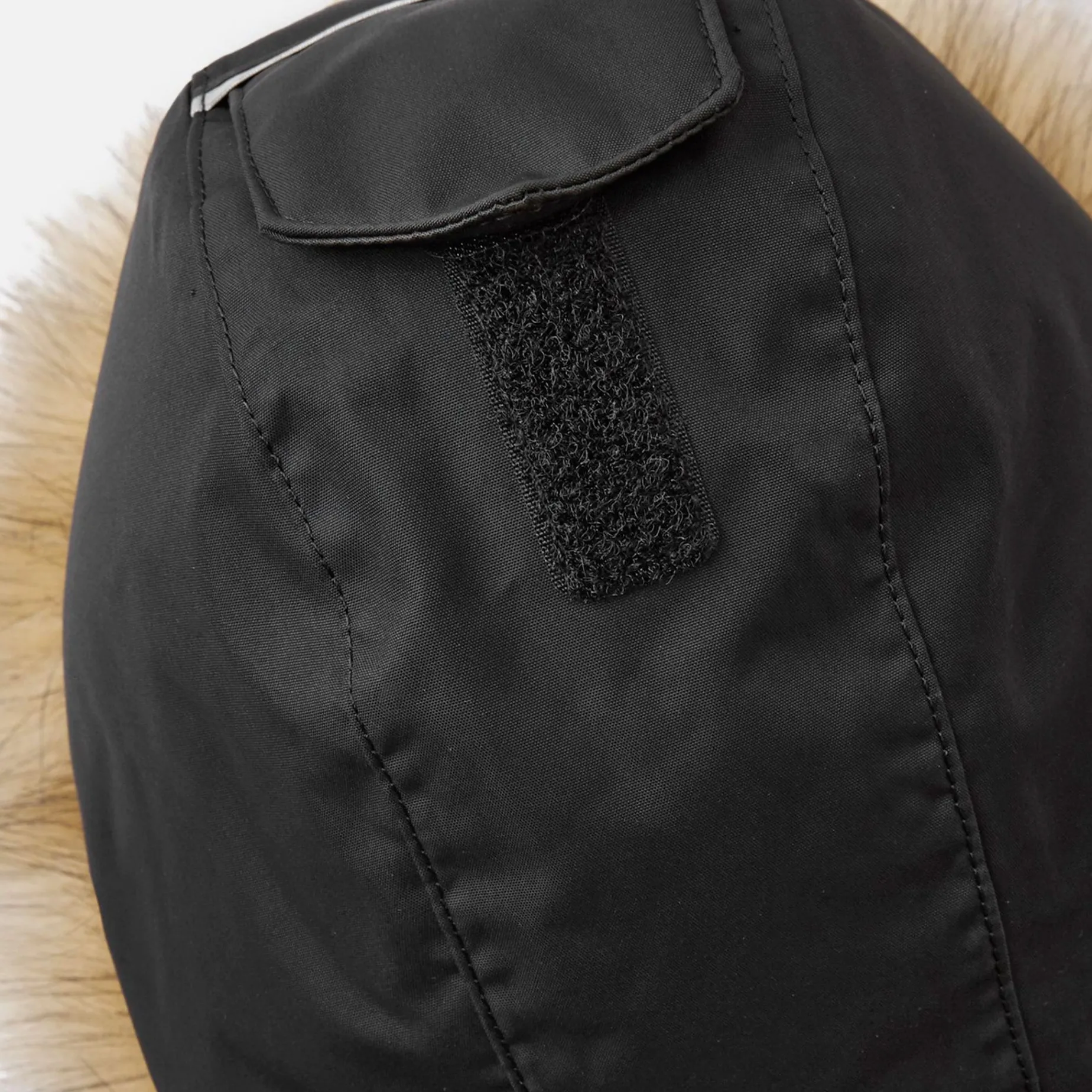 -Safe, detachable and adjustable hood with detachable faux fur trim