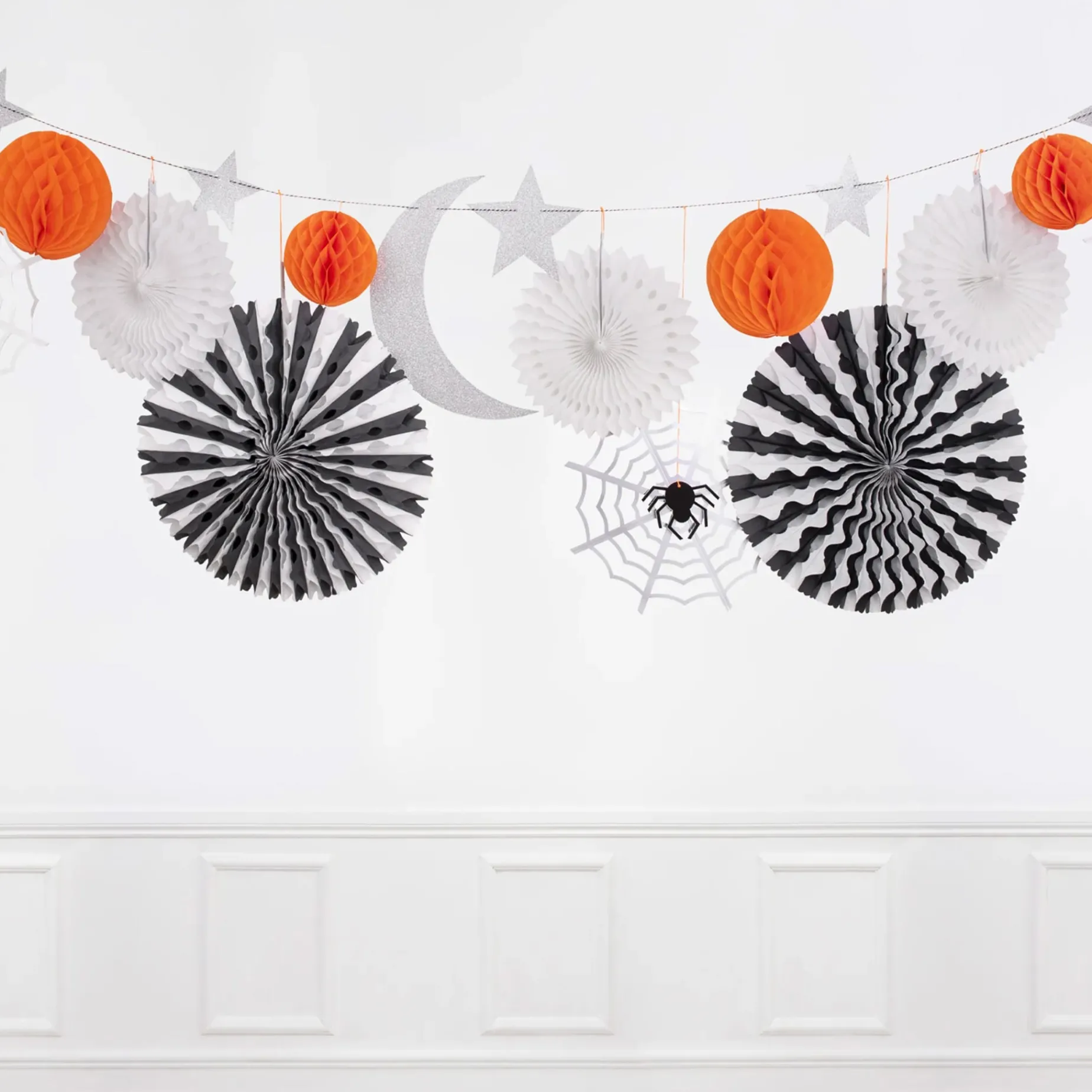 Garland features 5 pinwheels, 4 honeycomb balls, 3 silver foil cobwebs, 3 glittered spiders, 1 glittered crescent moon and 5 glittered stars