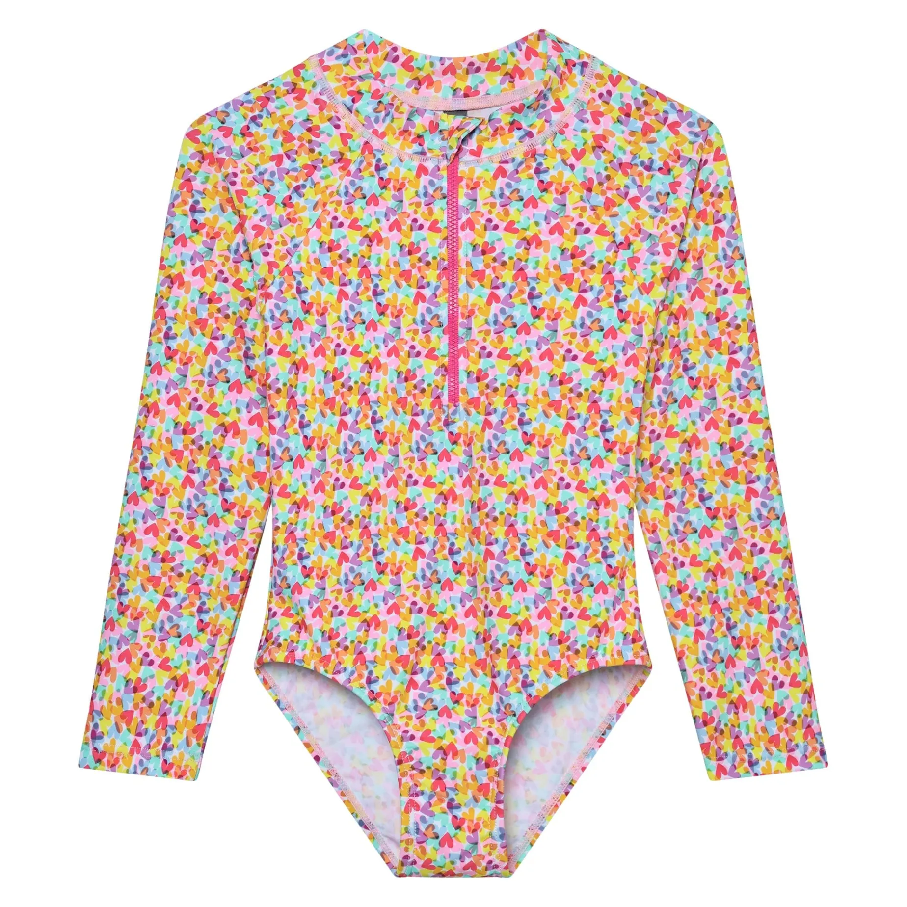 OEKO-TEX® STANDARD 100 Cert. No. 2276-364 DTI, Tested to UV STANDARD 801 UPF 60+ Long-sleeved swimsuit from Color Kids. The swimsuit has an all-over print. It closes with a front zipper and has a small fabric guard at the collar for extra comfort. Certified acc. to OEKO-TEX® STANDARD 100 Cert. No. 2276-364 DTI Tested and certified acc. to UPF 60+. To determine the UPF rating, the fabric is tested in both new and used conditions, following the UV STANDARD 801 method. The entire product is then CE-certified under PPE regulations.