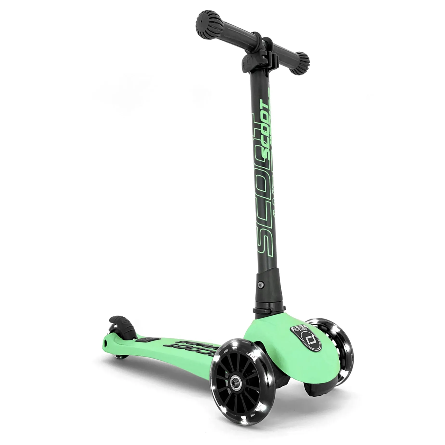 The Highwaykick 3 features 3 LED wheels and a three-height adjustable handlebar that folds easily for convenient transport (no tools required).