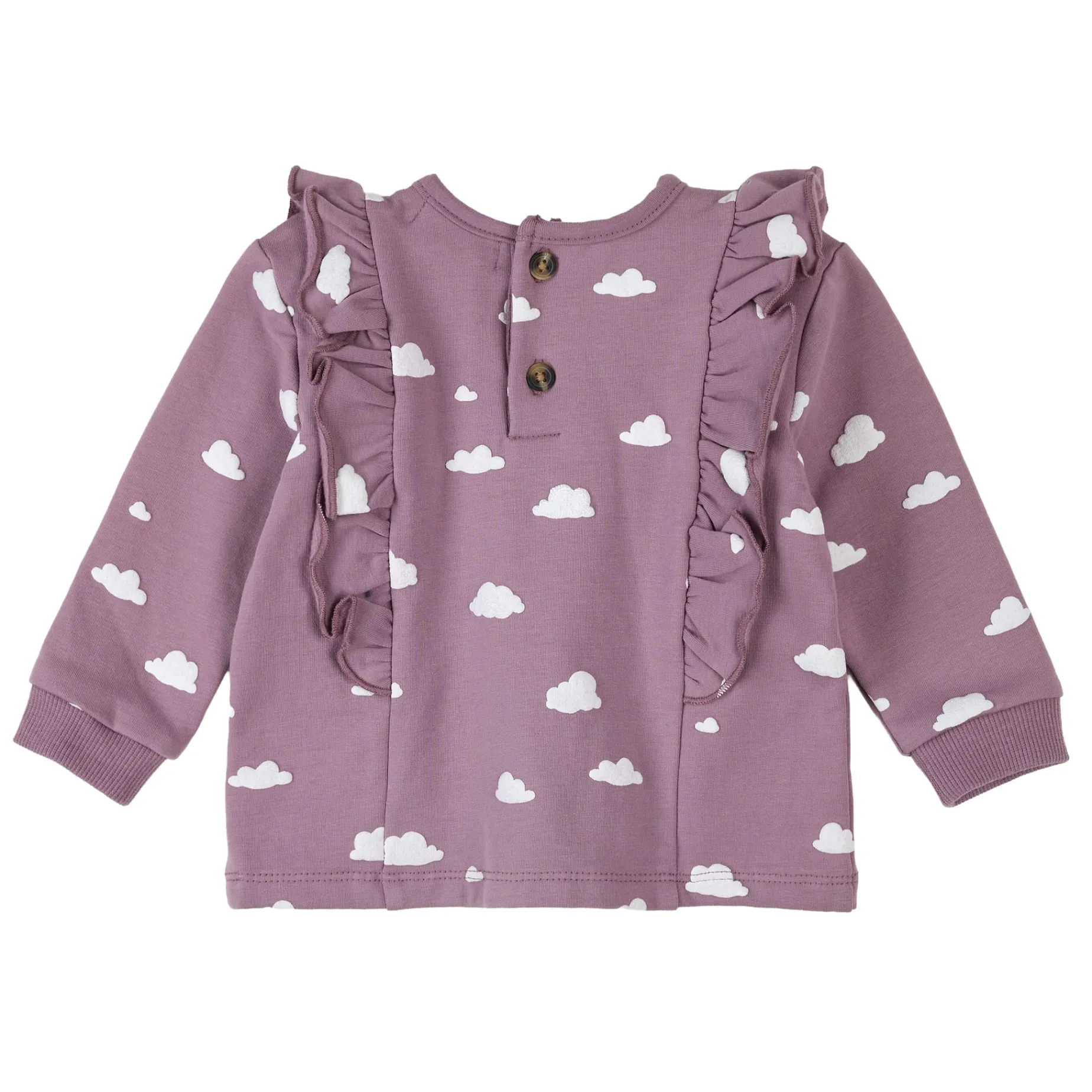 This organically grown cotton fleece set feels a cozy as a cloud and keeps them warm and comfortable for all-day adventures. The two-piece set includes a long-sleeved sweatshirt with frilly detailing and matching joggers. With a button placket at the back of the top, and a simple elasticated waistband on the joggers, the set is easy to pull on and off.