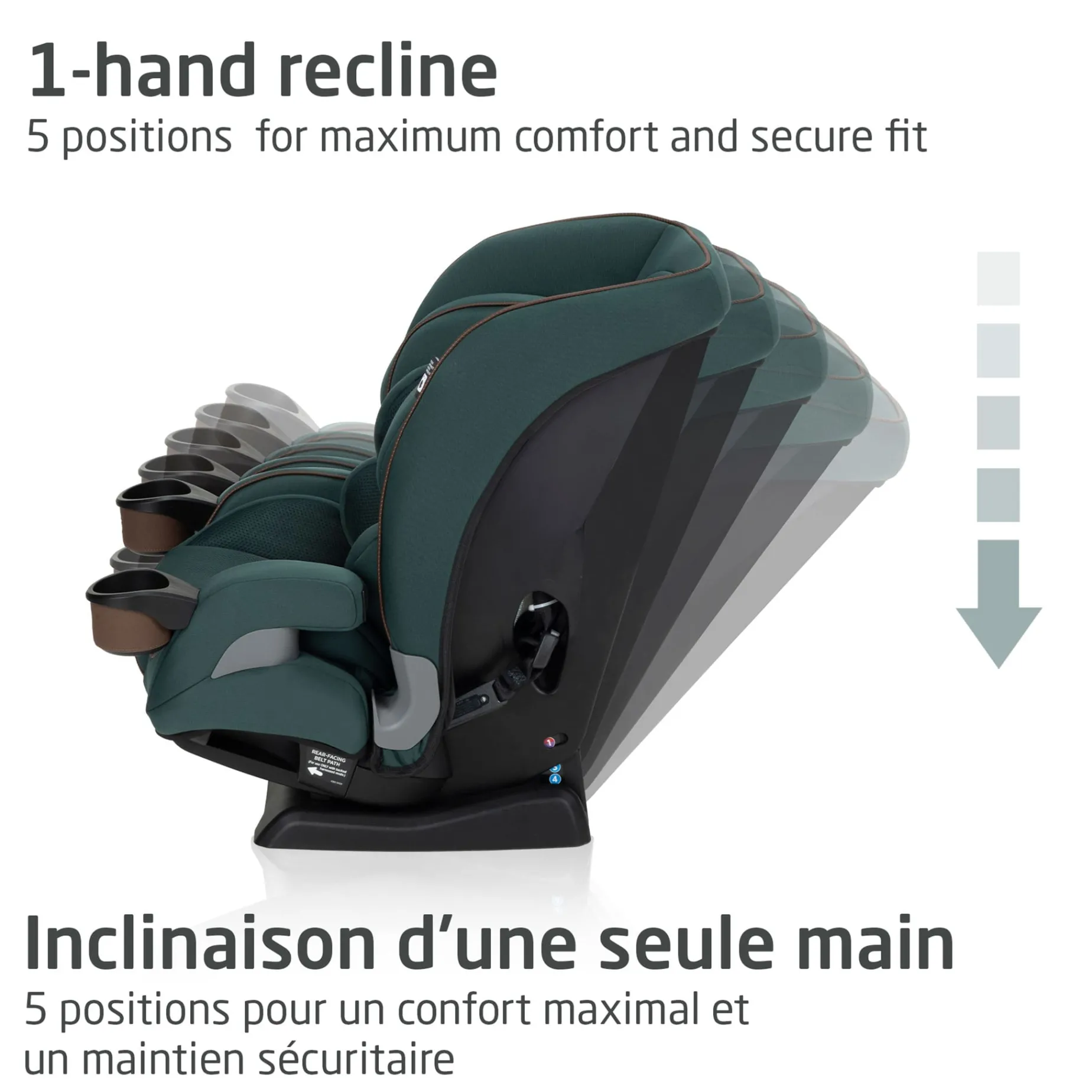 -Superb Fit: 1-handed lift to raise headrest and integrated no rethread harness provides 10 different positions to support all growth stages, whether rear-facing or forward-facing.5-position, 1-handed recline for maximum comfort and secure fit.