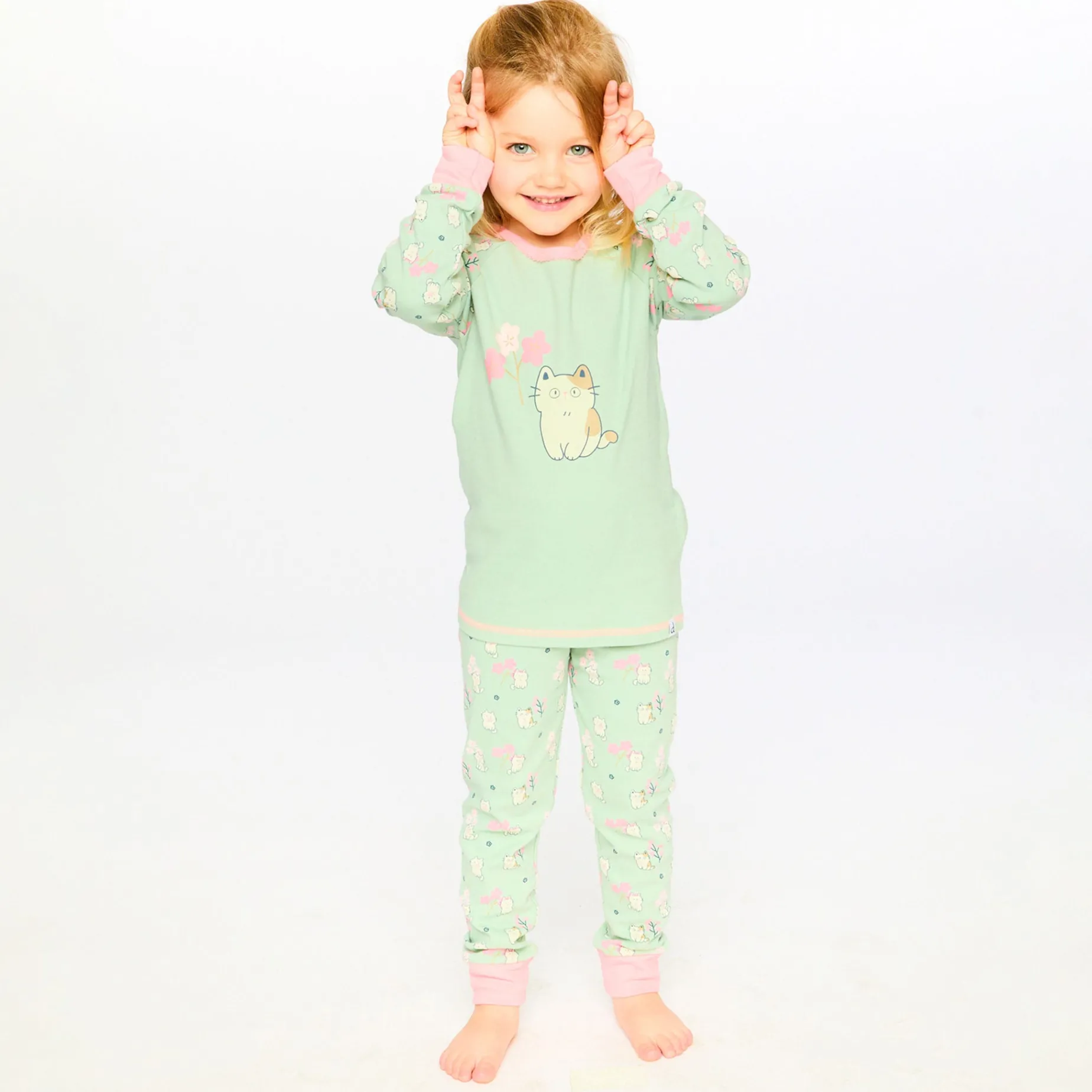 Cuteness overload is guaranteed with this two-piece pyjama set in a playful green kitten print. This set features a long-sleeve top with an adorable kitten holding a pink flower pairing perfectly with the matching pants covered in tiny kittens and blossoms, finished with pink fitted cuffs for extra charm. Made from soft organic cotton, this “Starry Night” collection set is as cozy as it is sweet, perfect for happy dreams.