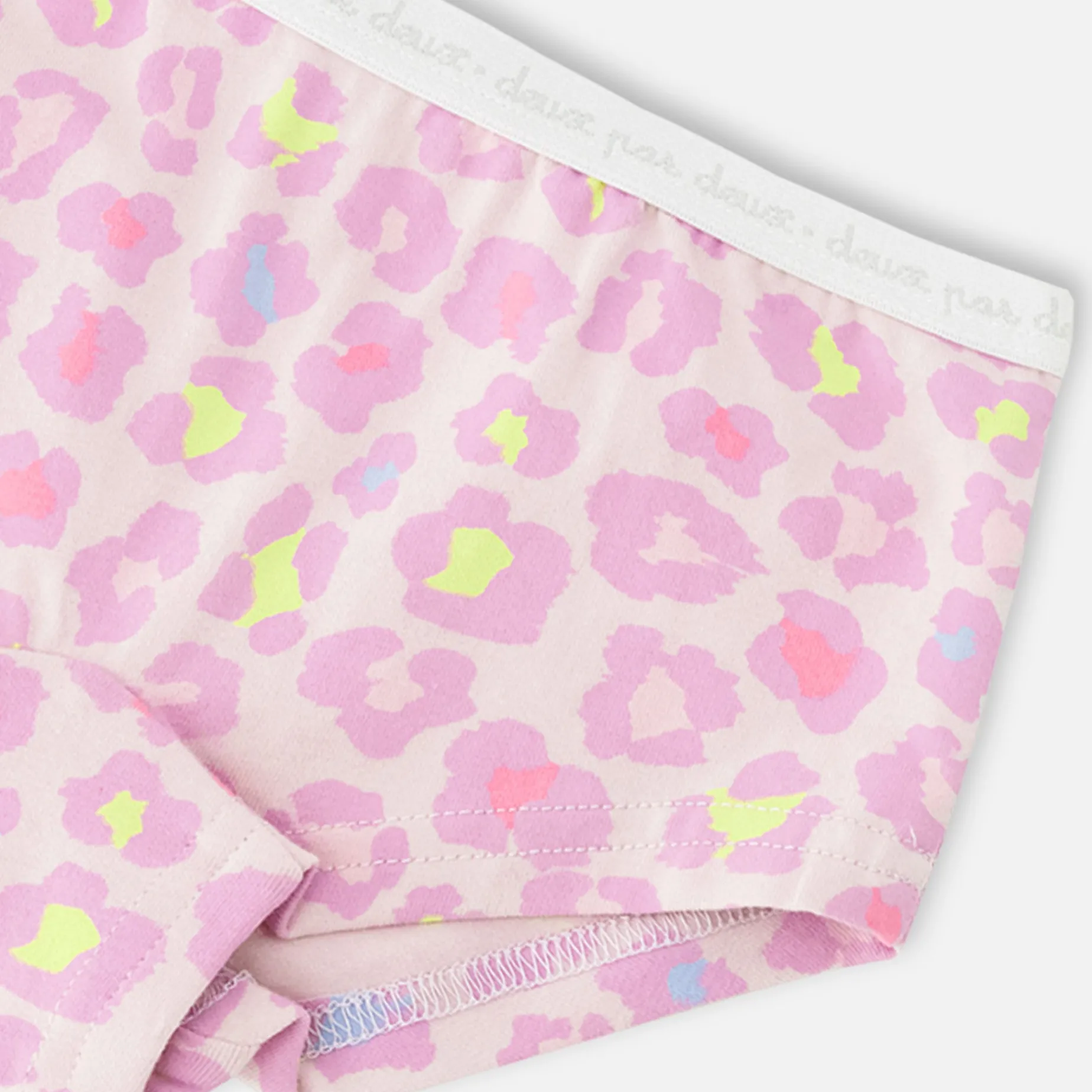 This pack of three boyshort panties brings together fun prints and everyday comfort. One panty features a playful purple leopard pattern, another is covered in cheerful pink smiling flowers on a blue background, and the third shows delicate blossoms on a pale pink base. Made with soft organic cotton and a touch of stretch, this set is designed to move with her all day long.