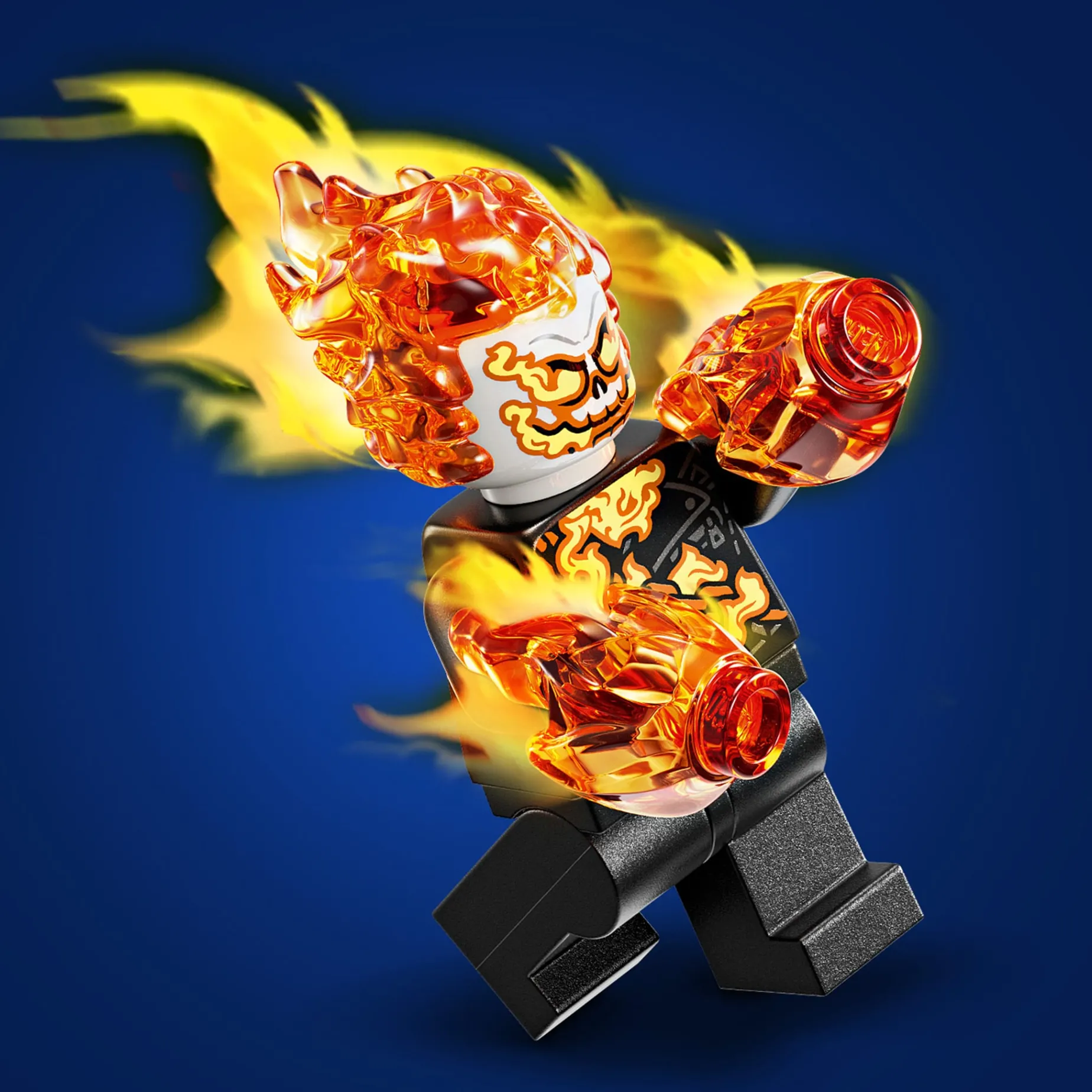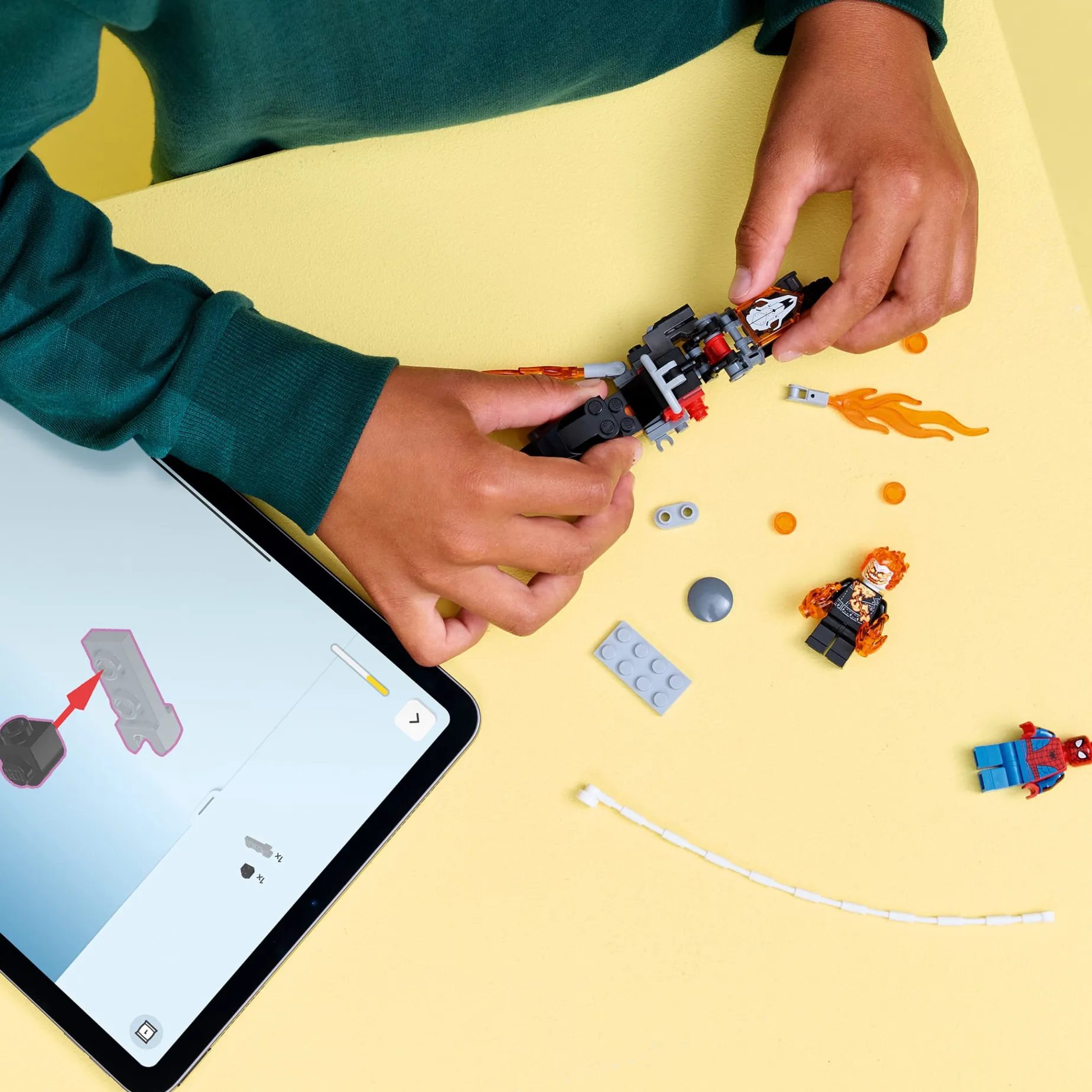 La figurine de Ghost Rider est représentée par un squelette avec des flammes qui s’échappent de ses mains et de sa tête. Sa moto emblématique comprend 2 pots d’échappement enflammés et 2 lance-tenons intégrés. Le fil de toile de la figurine de Spider-Man se fixe à la moto, offrant des possibilités de jeu de rôle infinies alors que les personnages s’affrontent sur et hors du véhicule à indice d’octane élevé. Cet ensemble de construction de 72 pièces est une excellente idée de cadeau pour les anniversaires des jeunes superhéros, des constructeurs LEGO et des amateurs de produits Spider-Man à collectionner. Avec l’application LEGO® Builder, les enfants peuvent construire en toute confiance : agrandir, faire pivoter les modèles en 3D et suivre leur progression grâce à des instructions numériques faciles à suivre. La moto mesure plus de 14 cm de long.