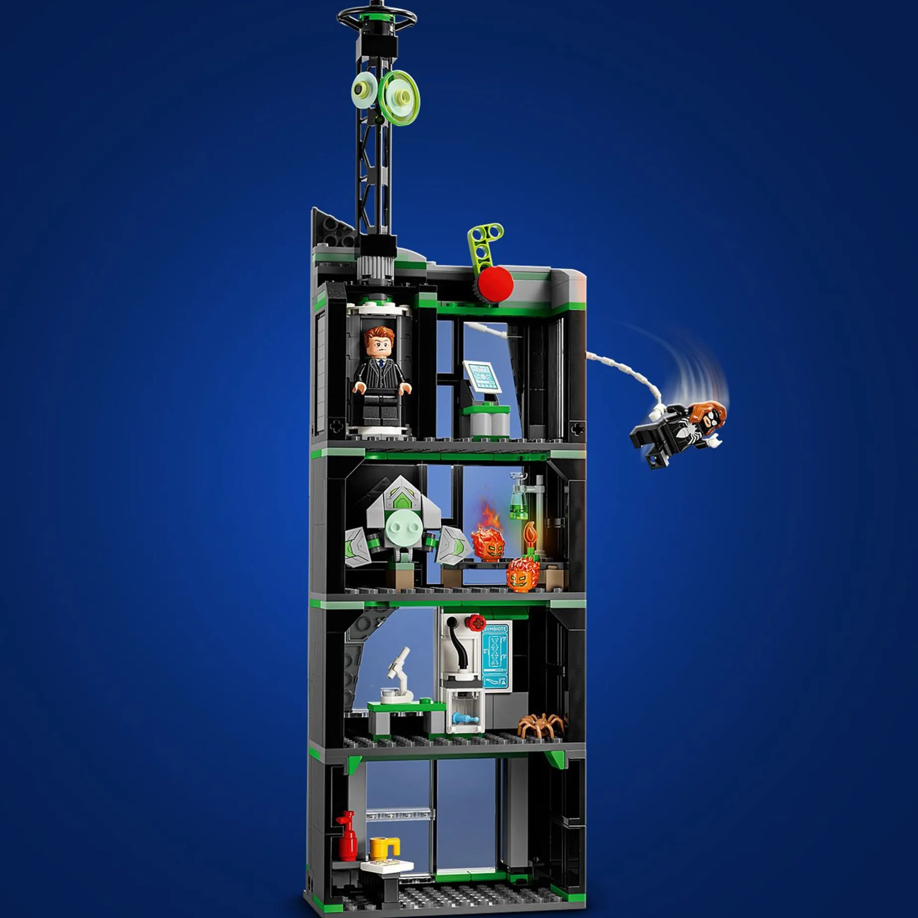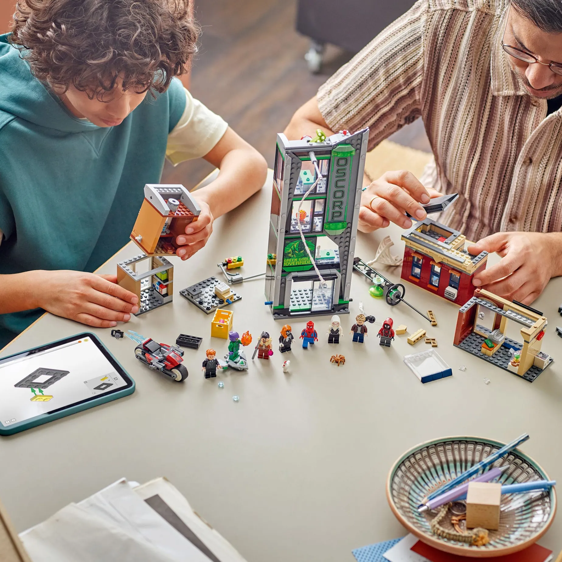 The street scene includes three distinct buildings: Miles Morales’ apartment with a jewelry store below, the Oscorp building, and Venom’s apartment with a grocery store underneath. Each area is furnished with appropriate equipment and accessories. Eight LEGO minifigures from the Marvel movies provide endless action: Spider-Man, Spider-Woman, Miles Morales with his motorcycle, Eddie Brock, Ghost-Spider, Norman Osborn, Kraven the Hunter and Green Goblin with his glider. Transparent rods let kids pose and display the characters realistically. The LEGO Builder app lets friends and family share the building fun together. Contains 808 pieces.