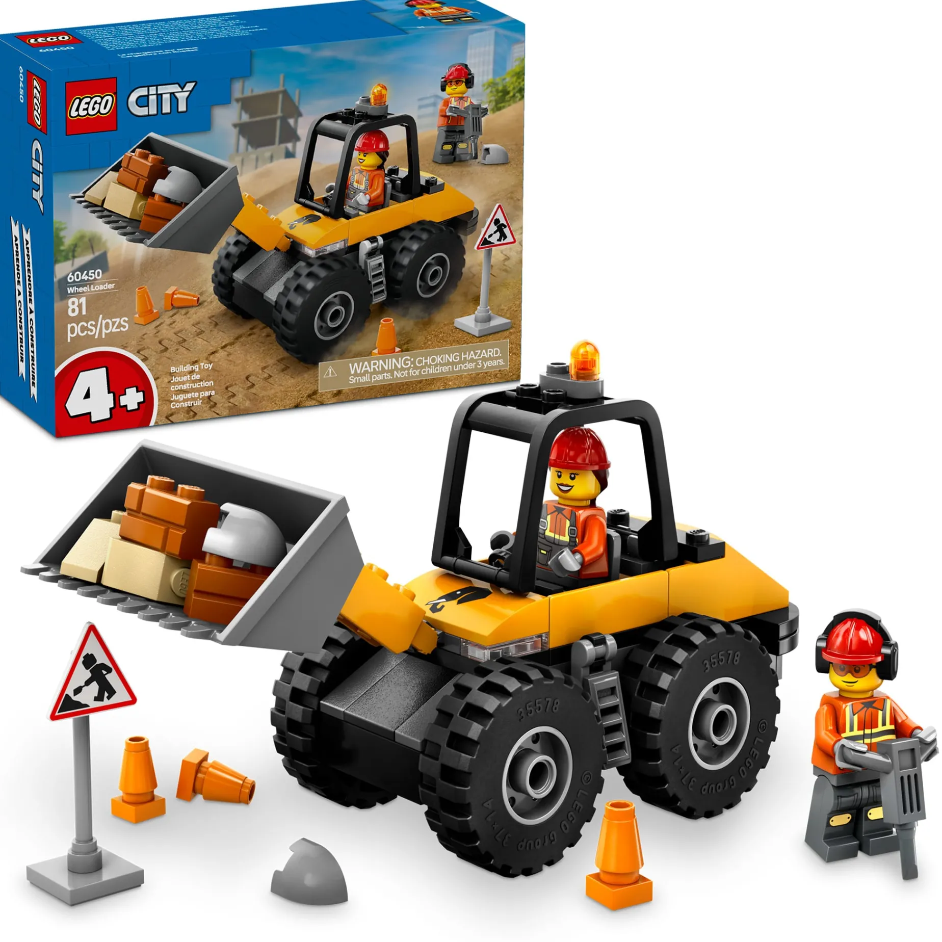 Introduce your child to the exciting world of construction with the LEGO® City Yellow Wheel Loader (60450). This construction vehicle set for 4+ kids features a large front bucket and big tires for navigating rough terrain. The set also includes a warning sign, traffic cones, a jackhammer, and driver and worker minifigures for creative role play and storytelling fun.