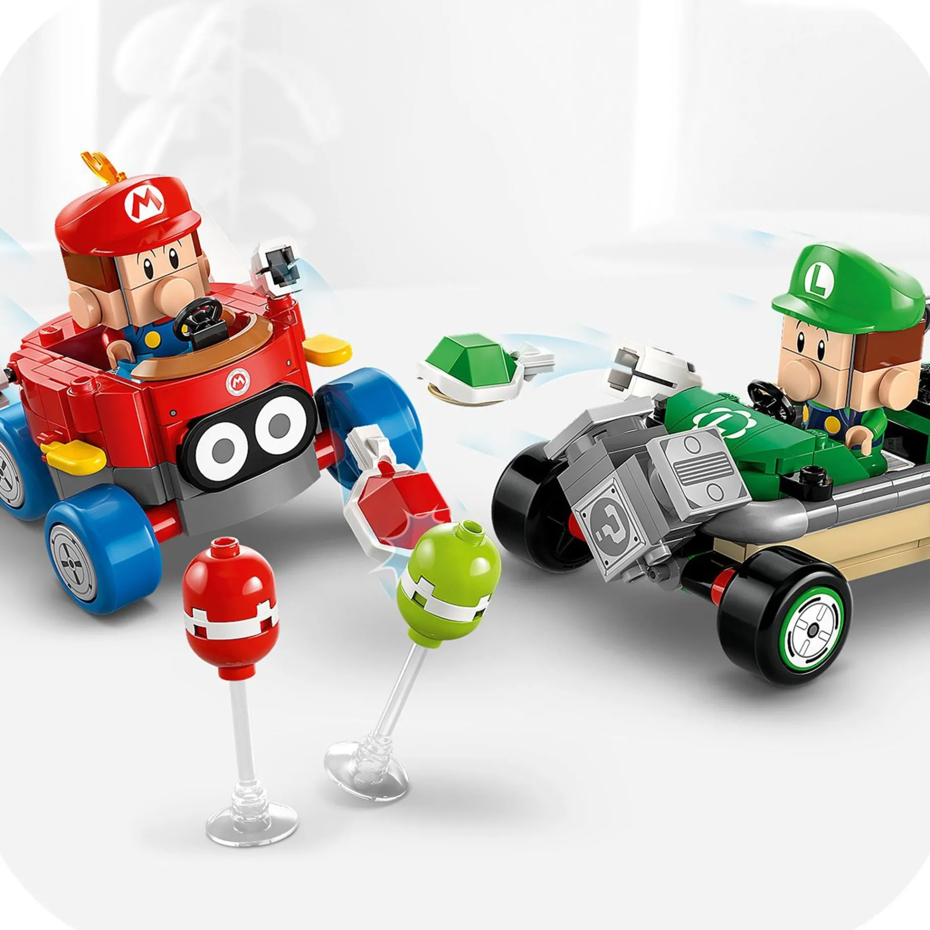 Take on balloon battles and high-speed racing with the Baby Mario vs. Baby Luigi playset for kids (72034). A thrilling Mario Kart™ birthday gift idea for boys, girls, and gamers aged 8 and up, this set includes two collectible Nintendo® figures — Baby Mario and Baby Luigi — along with their vehicles, the Para-Biddybud and the Tubul R3. Each buildable kart can launch shells, and the set also includes six buildable balloons (three red, three green) for players to aim at. Who will pop their opponent’s balloons first?