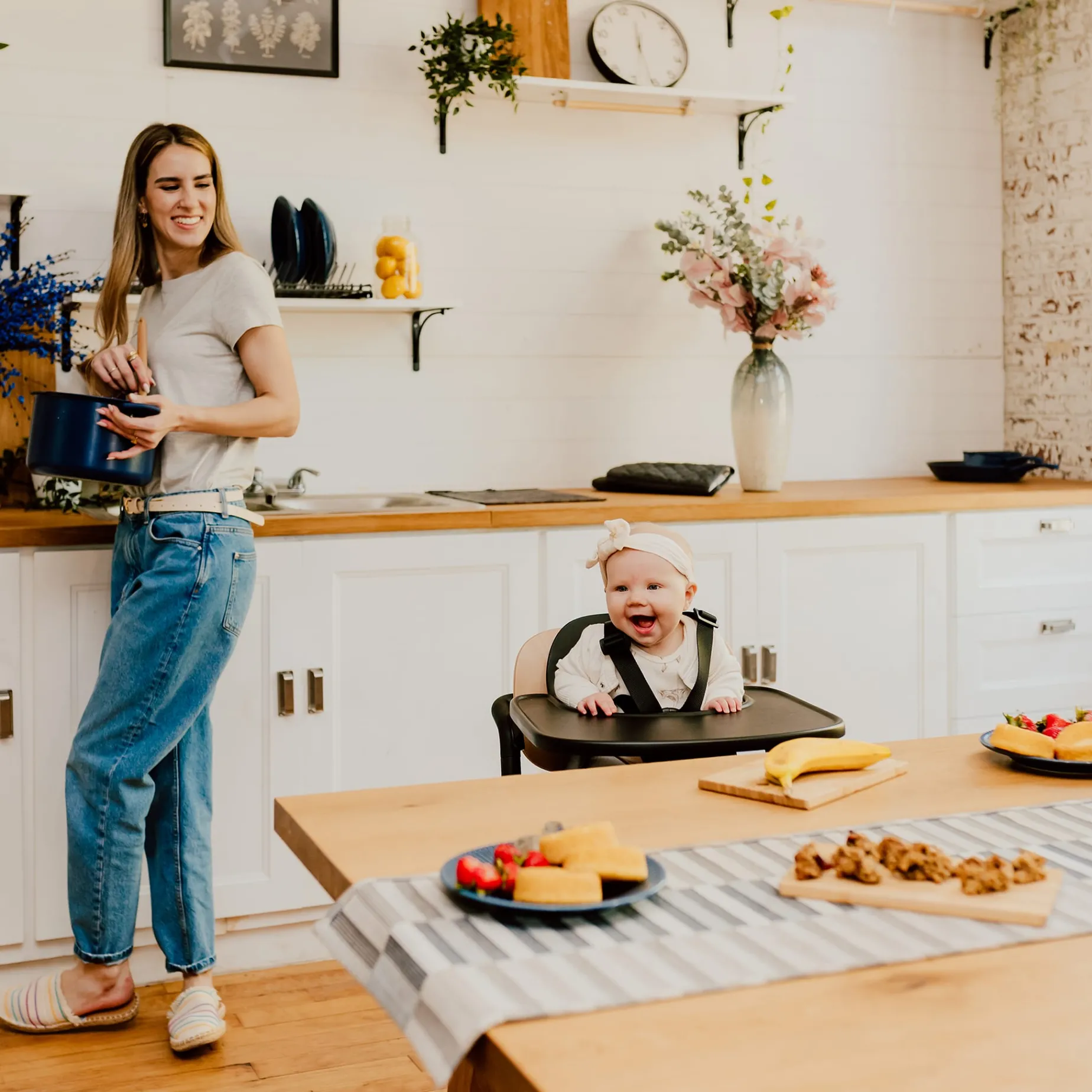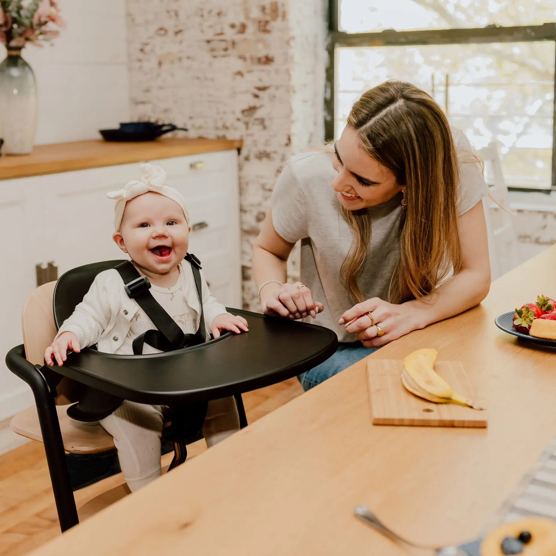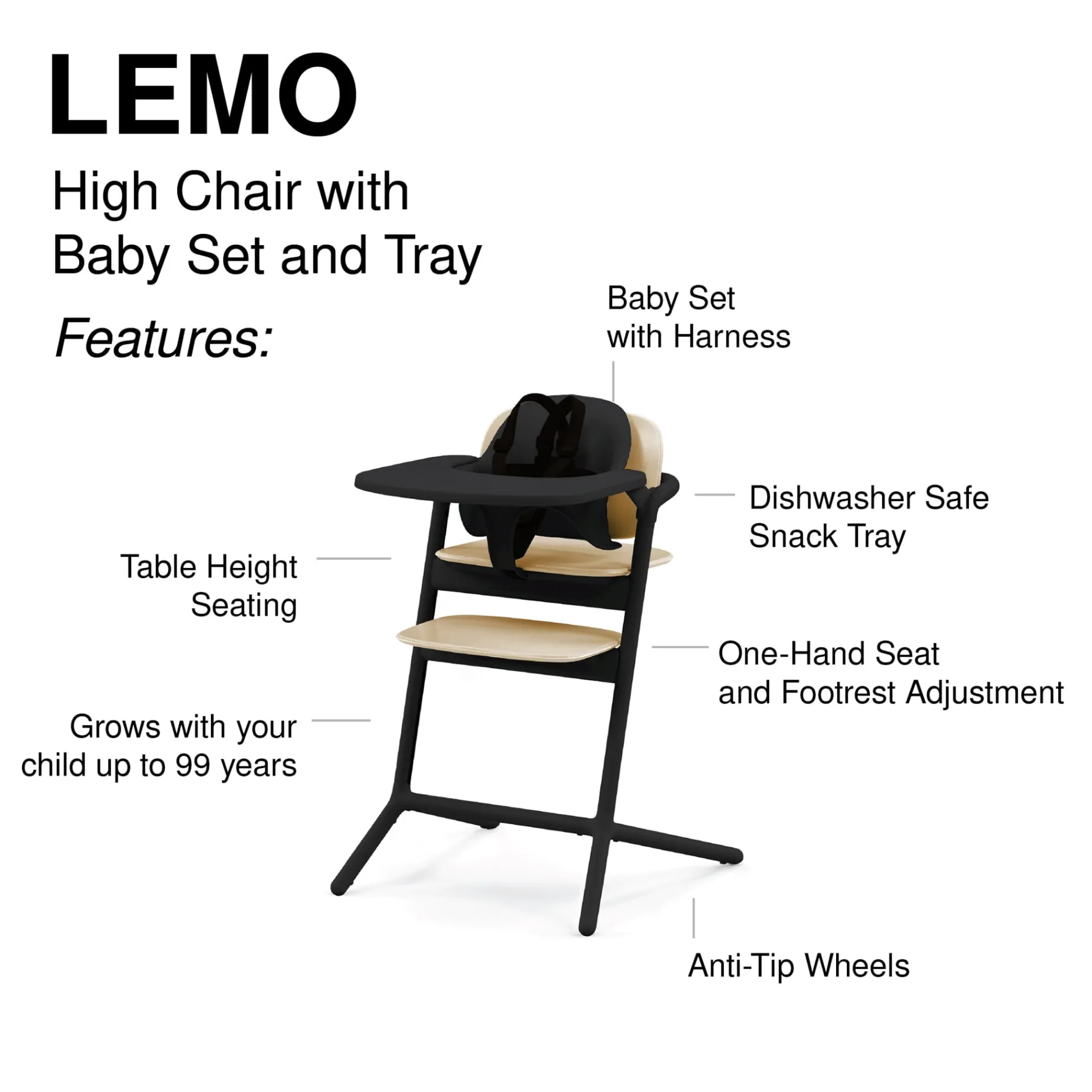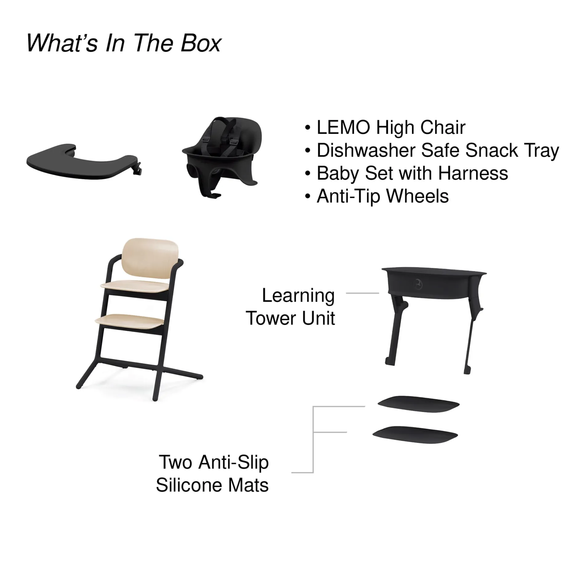 INCLUDES: LEMO 2 High Chair, dishwasher-safe snack tray, baby set with harness, LEMO Learning Tower with two anti-slip silicone mats