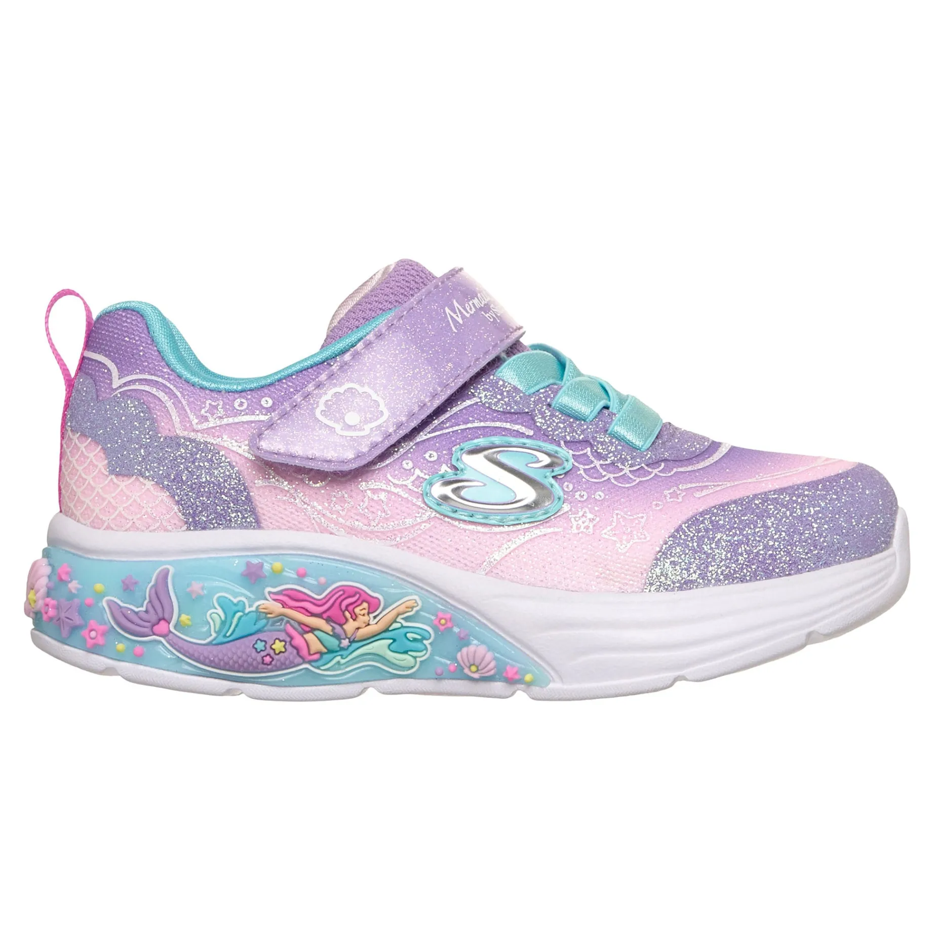 Playful lights and colorful fun combine in Skechers My Dreamers – Lil Mermaid. This light-up sky-themed style features an ombre glitter mesh and synthetic upper with stretch laces, adjustable instep strap and a well-cushioned light-up midsole.